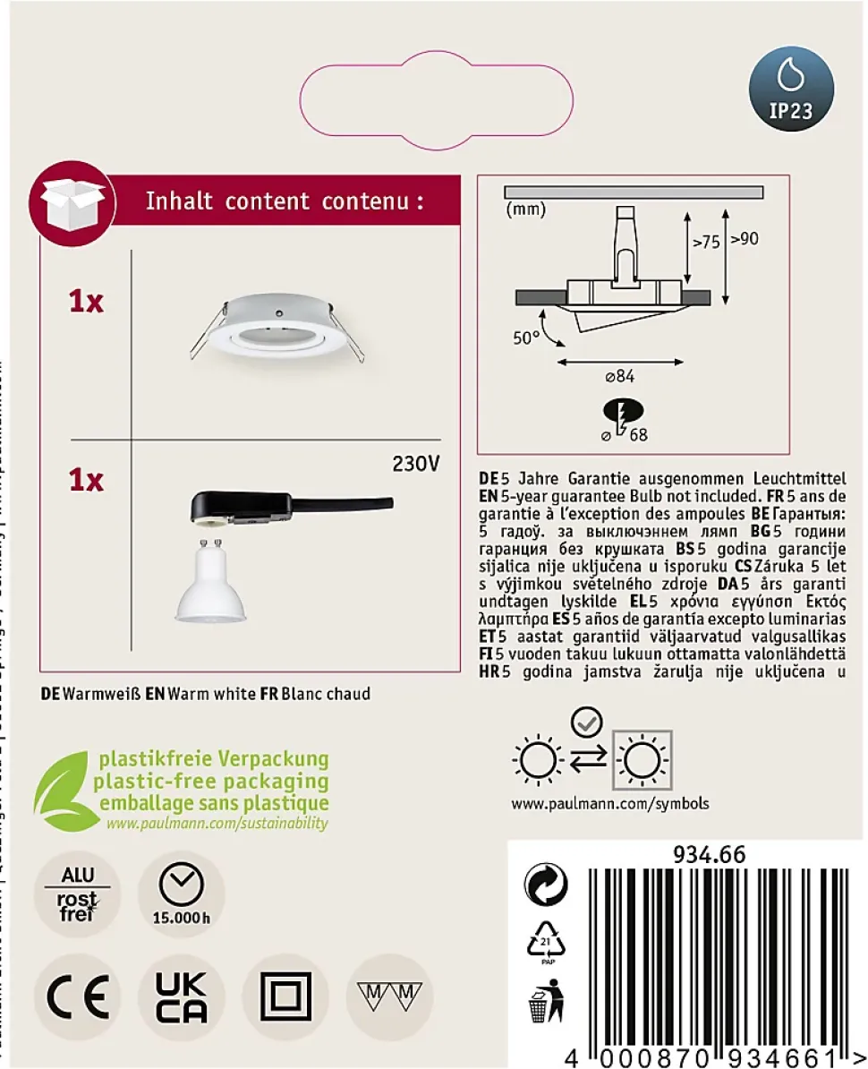 Le spot encastré Nova rond en blanc dépoli avec 6,5W et 460lm offre une lumière agréable, un design adapté et une haute efficacité énergétique. Orientables, les spots diffusent la lumière précisément là où vous le souhaitez. Le style pur n’est pas dévalorisé par des circlips : Comme l’ampoule est insérée par l’arrière, nul besoin de circlip. Grâce à la connexion 230 V directe, vous pouvez très facilement connecter des luminaires entre eux sans aucune limite. La fixation simple par ressorts de retenue conserve le plafond intact, même après plusieurs montages et démontages. La livraison inclut des ampoules LED GU10 performantes et durables dont la lumière blanc chaud crée une atmosphère conviviale. La fonction 3-Step-Dim intégrée vous permet de naviguer entre trois intensités de lumière en actionnant plusieurs fois un simple commutateur traditionnel.