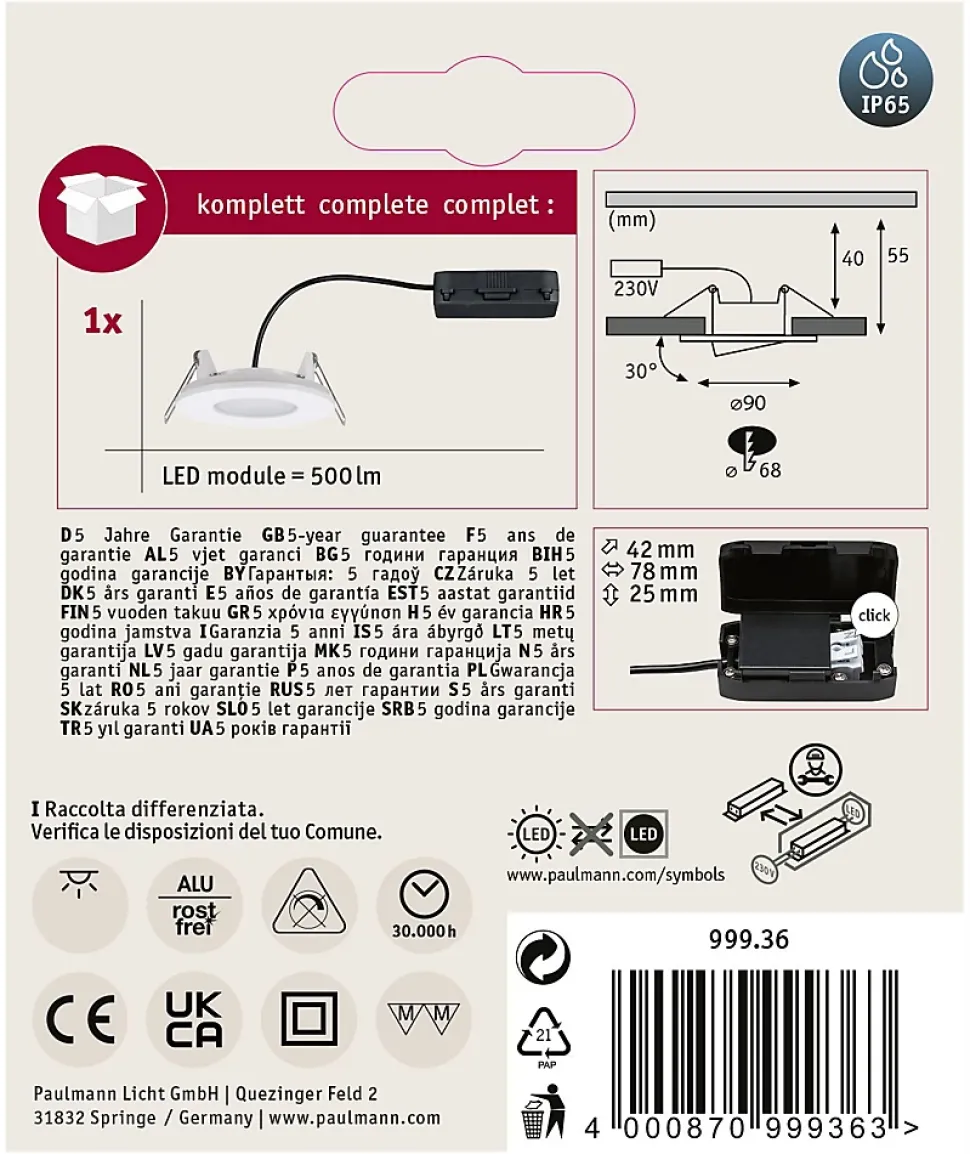Température de couleur: 4000K – Blanc neutre|Protection IP65 pour pièces humides ou extérieur|Pour raccordement direct au secteur 230V