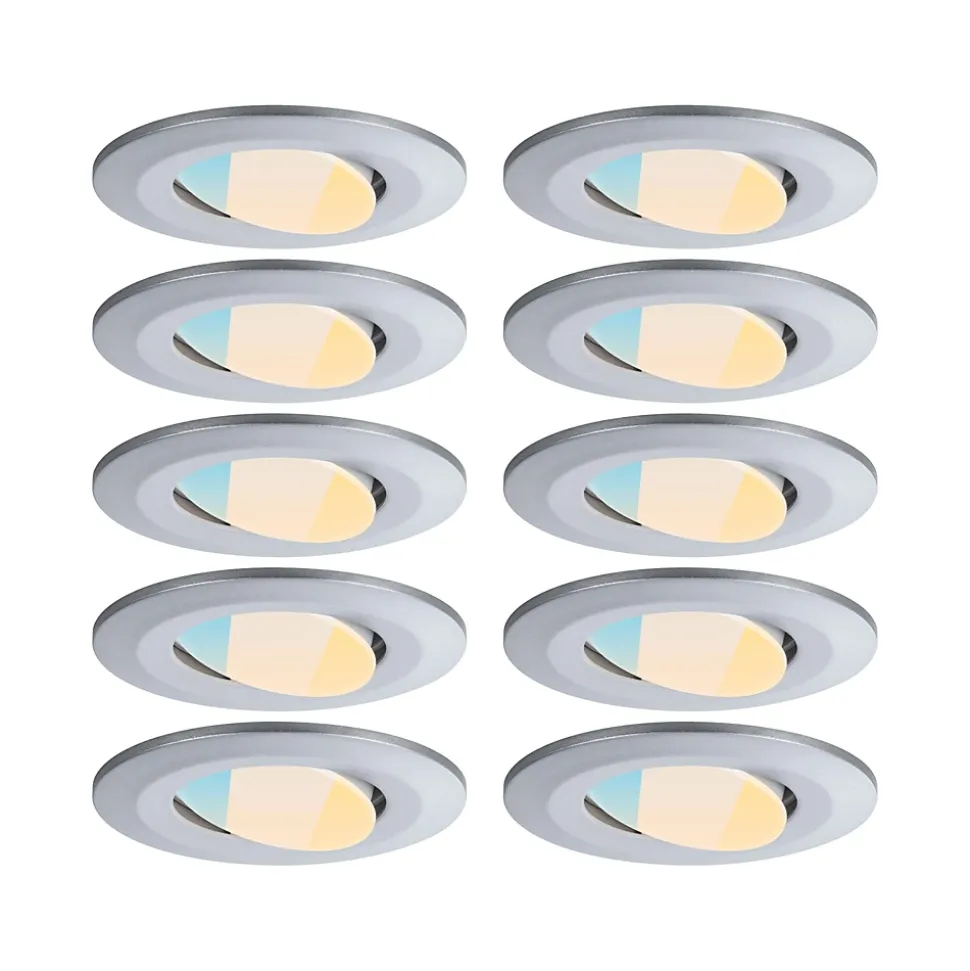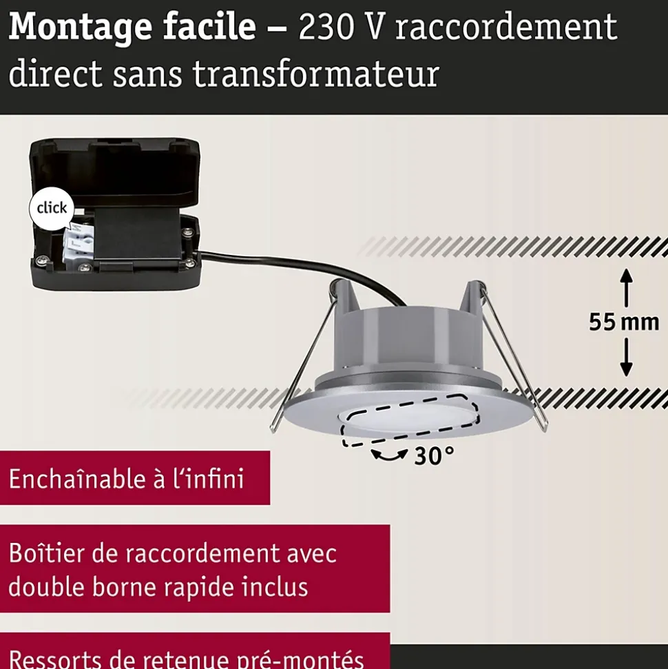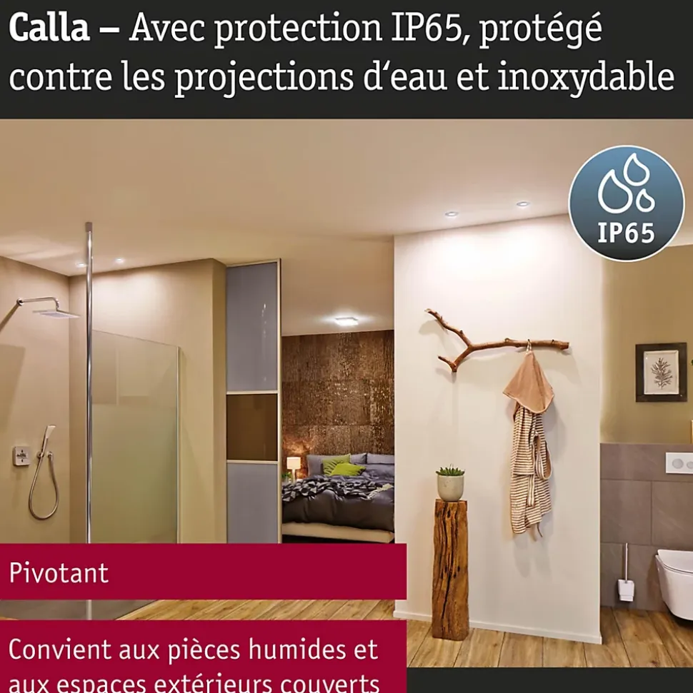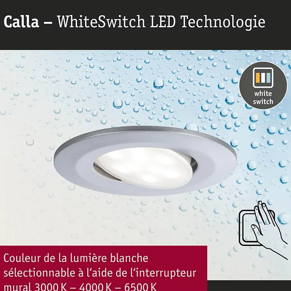 Il est compact, personnalisable et extrêmement lumineux. La polyvalence du spot encastré LED Calla en Chrome mat vendu par lot de 10 convient particulièrement aux pièces humides. Pourvu de la protection contre les projections d’eau IP65, il ne craint pas l’humidité. Sa forme discrète s’intègre dans tous les styles d’intérieurs. Grâce à la fonction WhiteSwitch, la température de couleur peut être réglée de manière individuelle via commutateur mural en fonction de l’heure de la journée et selon vos besoins. Grâce à leur capacité de pivotement, les spots diffusent la lumière précisément là où vous le souhaitez.