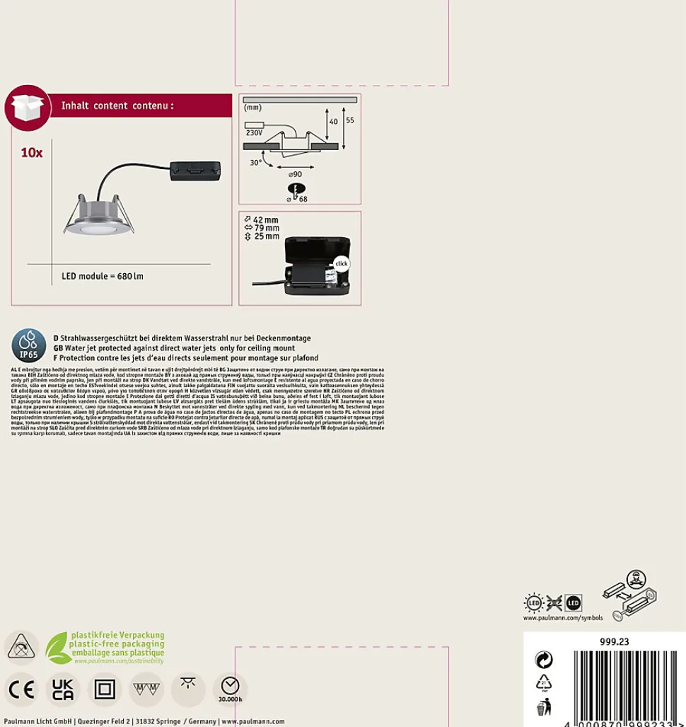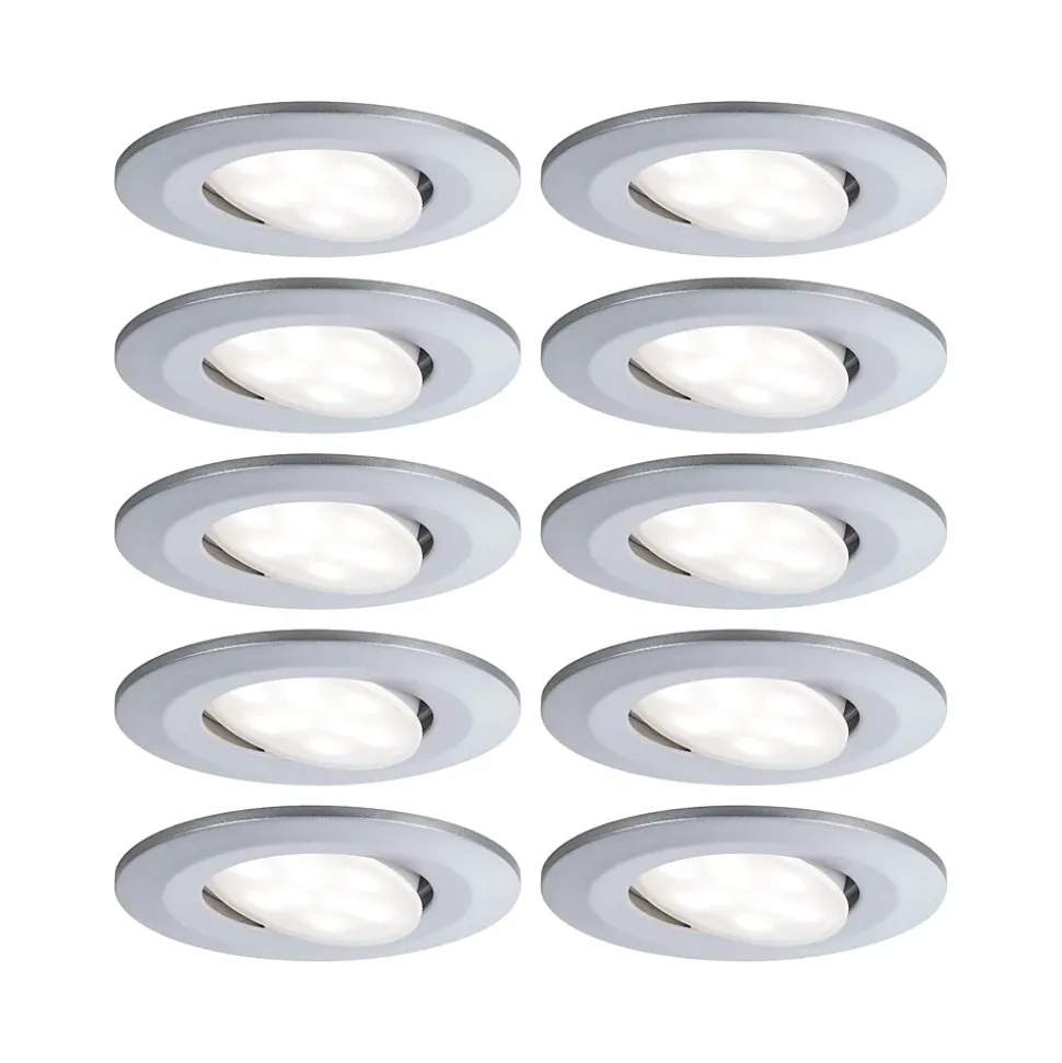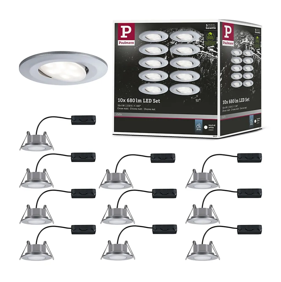 Kit de 10 luminaires|Température de couleur: 4000K – Blanc neutre|Protection IP65 pour pièces humides ou extérieur|Avec des spots réglables pour un éclairage optimal|Pour raccordement direct au secteur 230V