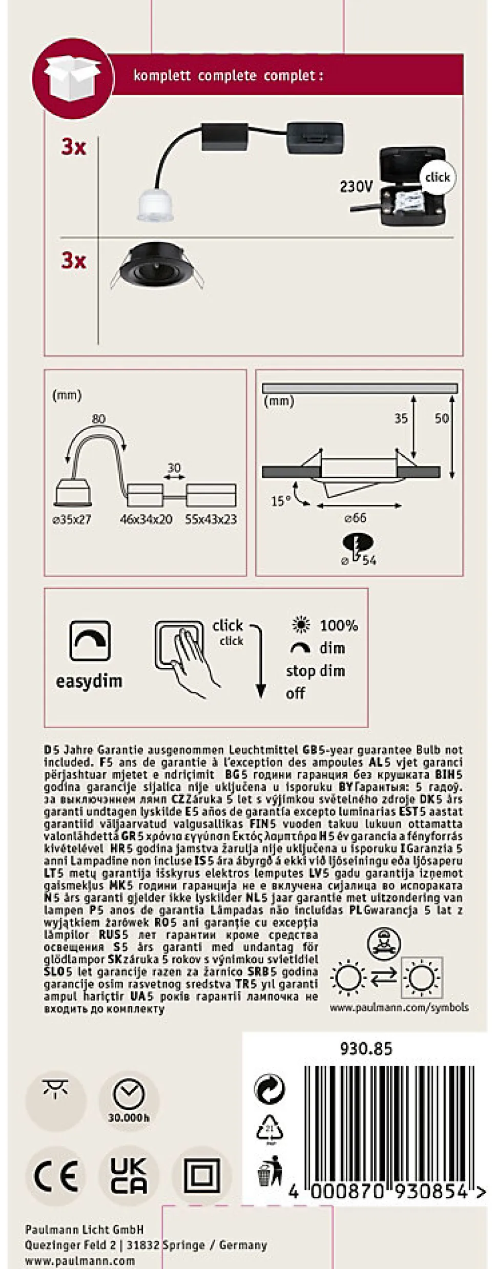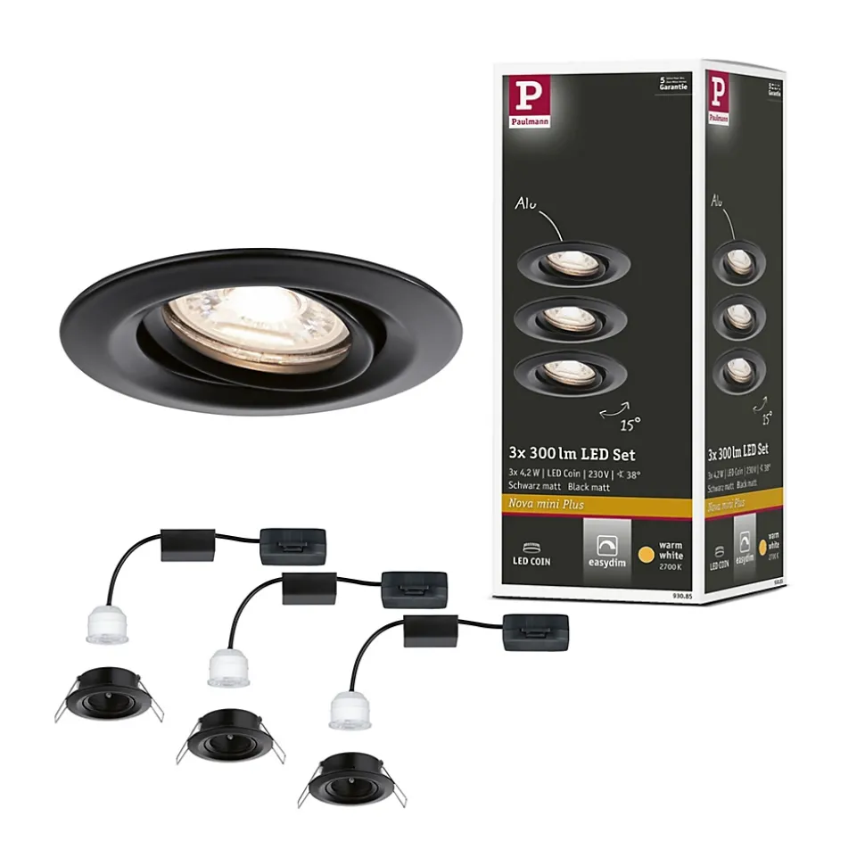Kit composé de 3 luminaires fourni avec module LED|Température de couleur: 2700K – Blanc chaud|EasyDim : variation de l’intensité en continu grâce à votre interrupteur mural existant|Pour raccordement direct au secteur 230V