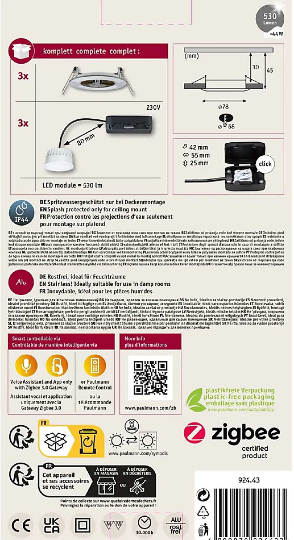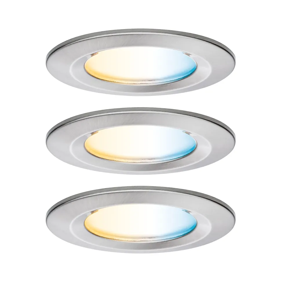 Kit composé de 3 luminaires fourni avec module LED|protection ip : ip 44 – protection contre des projections d’eau|Tunable White offre un choix infini, de lumière dorée (2200 K) à blanc lumière du jour (6500 K)|La fonction de mémoire enregistre le dernier niveau utilisé jusqu’à la prochaine mise en marche.|S’intègre parfaitement aux infrastructures Zigbee Smart Home existantes.|Possibilité de continuer à allumer et éteindre via l’interrupteur d’éclairage|Profondeur d’encastrement réduite (45 mm)|Raccordement direct au 230 V grâce aux Coins connectables