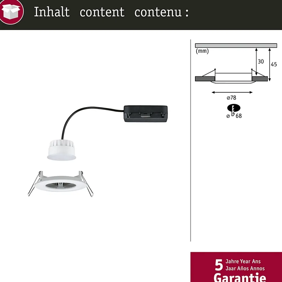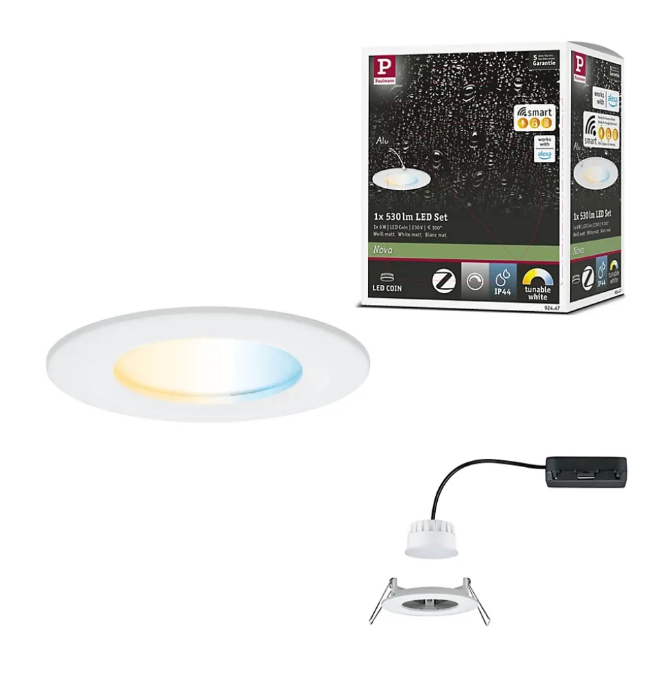 Kit composé de 1 luminaire avec module LED|protection ip : ip 44 – protection contre des projections d’eau|Tunable White offre un choix infini, de lumière dorée (2200 K) à blanc lumière du jour (6500 K)|La fonction de mémoire enregistre le dernier niveau utilisé jusqu’à la prochaine mise en marche.|S’intègre parfaitement aux infrastructures Zigbee Smart Home existantes.|Possibilité de continuer à allumer et éteindre via l’interrupteur d’éclairage|Profondeur d’encastrement réduite (45 mm)|Raccordement direct au 230 V grâce aux Coins connectables