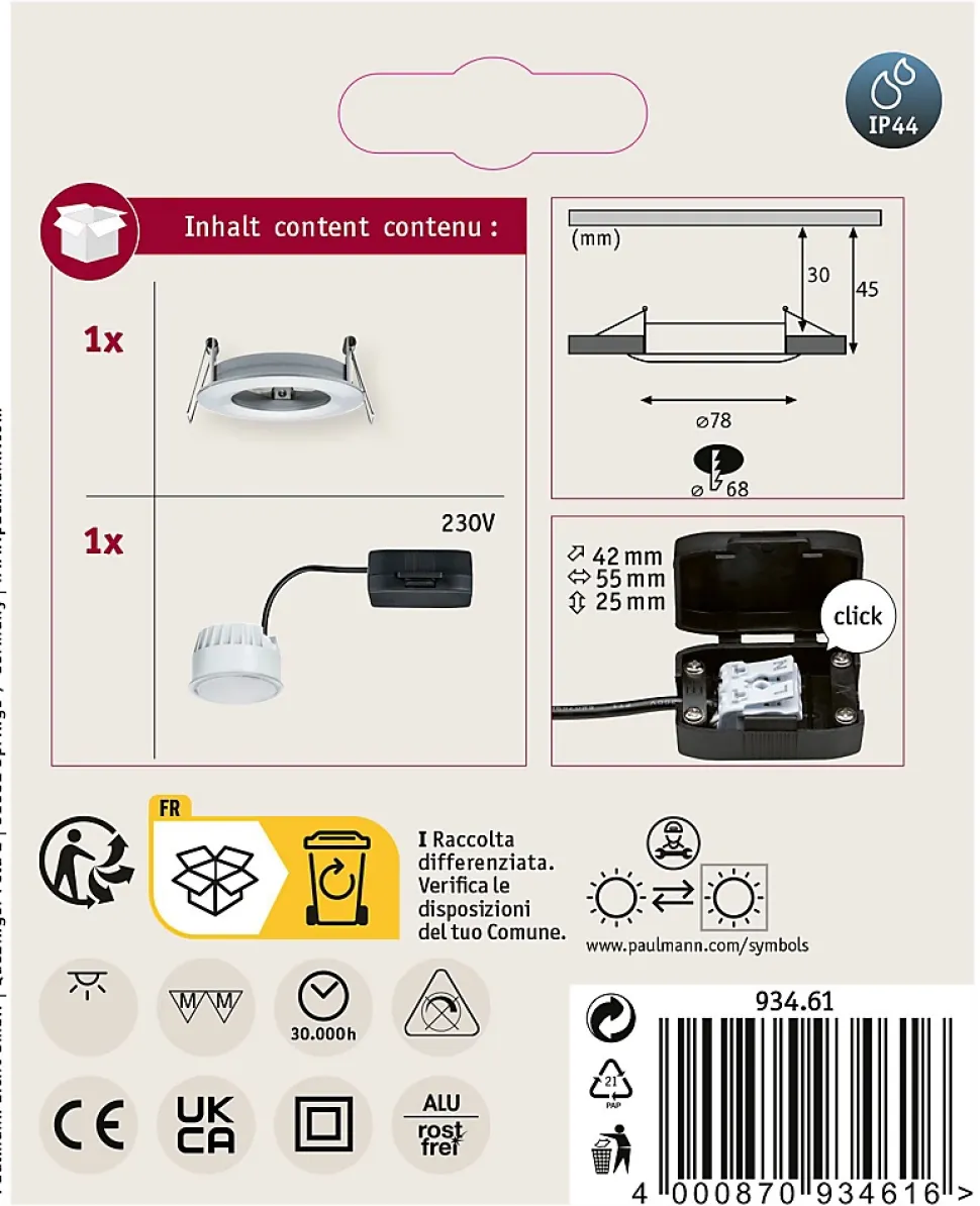 Le spot encastré Nova rond en Alu tourné avec LED-Coin remplaçable convient aussi bien à l’équipement de nouvelles installations qu’au remplacement d’équipements existants. De forme particulièrement plate, il s’intègre dans les plafonds disposant d’un espace creux de 30 mm seulement. Grâce à un raccordement sans outils par clips de fixation rapides, les luminaires individuels sont simples et rapides à monter. Avec leur protection anti-projections d’eau IP44, ce luminaire garantit une lumière blanc chaud chaleureuse tant dans la salle de bain que dans la cuisine.