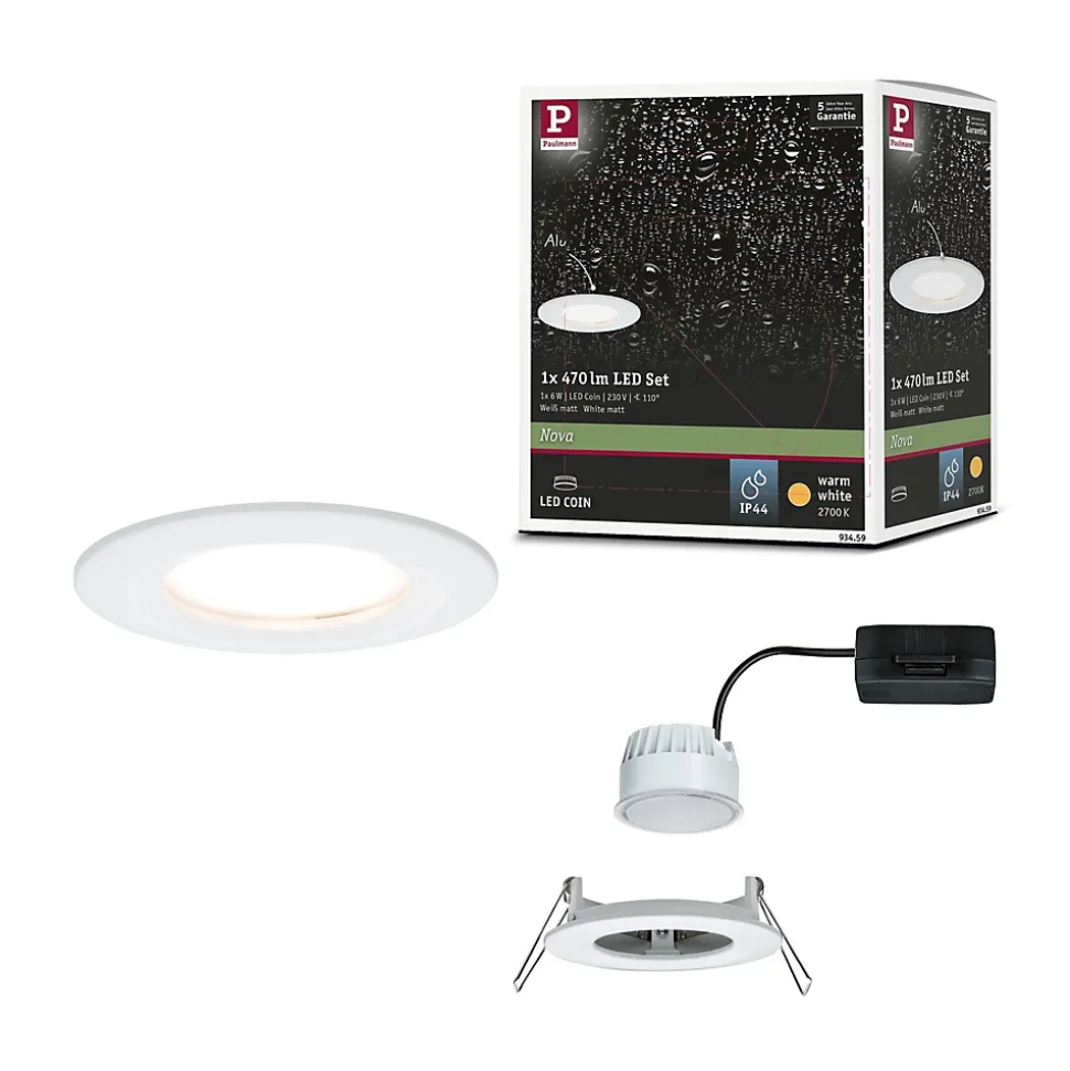 Le spot encastré Nova rond en Blanc dépoli avec LED-Coin remplaçable convient aussi bien à l’équipement de nouvelles installations qu’au remplacement d’équipements existants. De forme particulièrement plate, il s’intègre dans les plafonds disposant d’un espace creux de 30 mm seulement. Grâce à un raccordement sans outils par clips de fixation rapides, les luminaires individuels sont simples et rapides à monter. Avec leur protection anti-projections d’eau IP44, ce luminaire garantit une lumière blanc chaud chaleureuse tant dans la salle de bain que dans la cuisine.