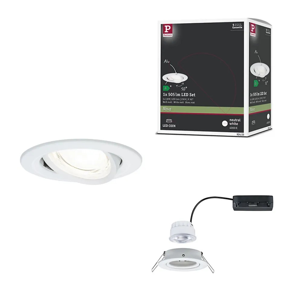 Kit composé de 1 luminaire avec module LED|Kit ENC en classe d’efficacité énergétique A (Module LED)|préserve les ressources grâce à une durée de vie élevée de 50 000h|Température de couleur: 4000K – Blanc neutre|Matériau haut de gamme en alu moulé sous pression|Design intemporel pour tous les styles de logement|Grande flexibilité grâce à la capacité de pivotement|Raccordement direct au 230 V grâce aux Coins connectables|Faible profondeur d’encastrement des spots encastrés Nova Coin|Installation simple des spots encastrés