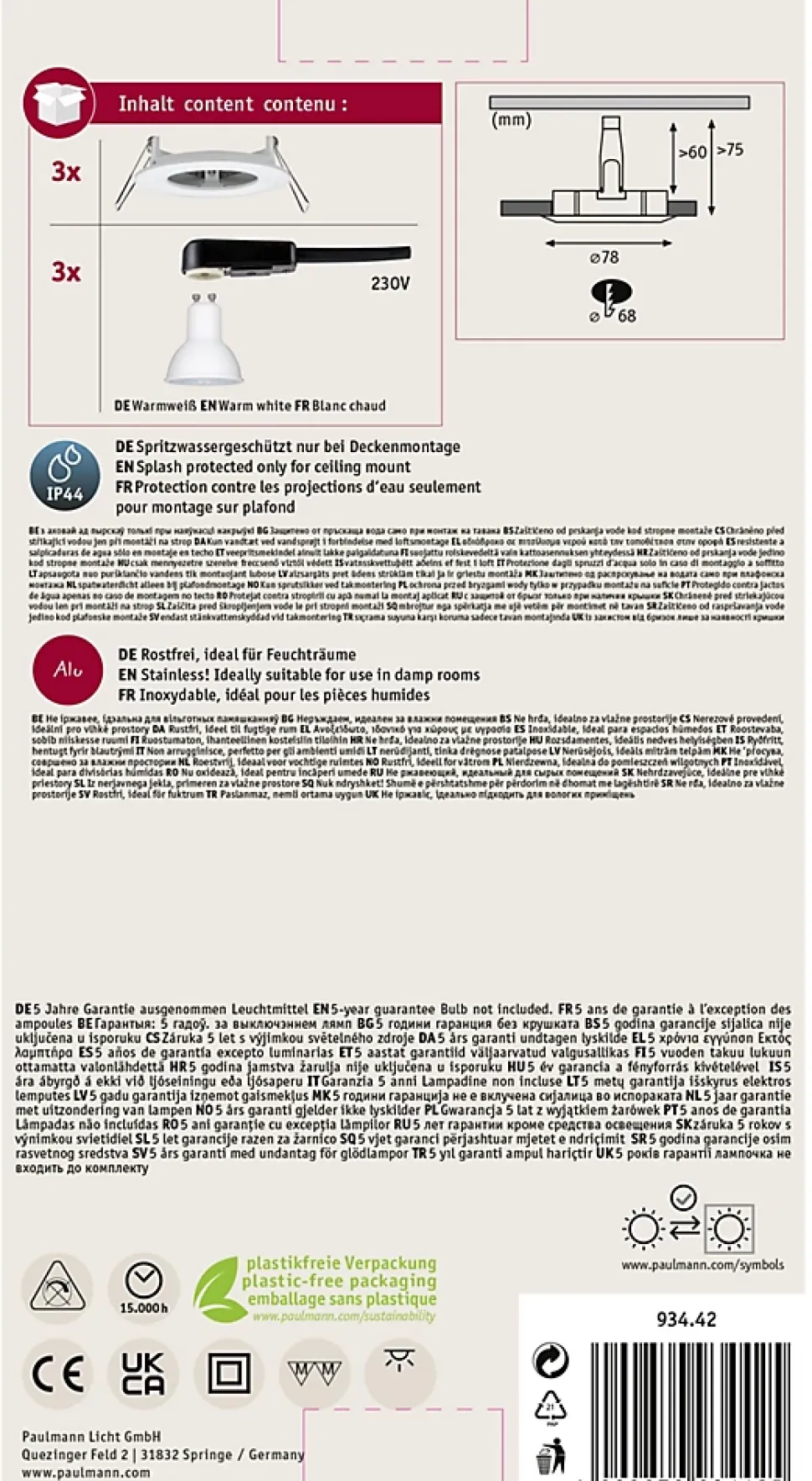 Les spots encastrés Nova ronds en blanc dépoli avec 3×6,5W et 3x460lm offrent une lumière agréable, un design adapté et une haute efficacité énergétique. Le style pur n’est pas dévalorisé par des circlips : Comme l’ampoule est insérée par l’arrière, nul besoin de circlip. Grâce à la connexion 230 V directe, vous pouvez très facilement connecter des luminaires entre eux sans aucune limite. La fixation simple par ressorts de retenue conserve le plafond intact, même après plusieurs montages et démontages. La livraison inclut des ampoules LED GU10 performantes et durables dont la lumière blanc chaud crée une atmosphère conviviale.