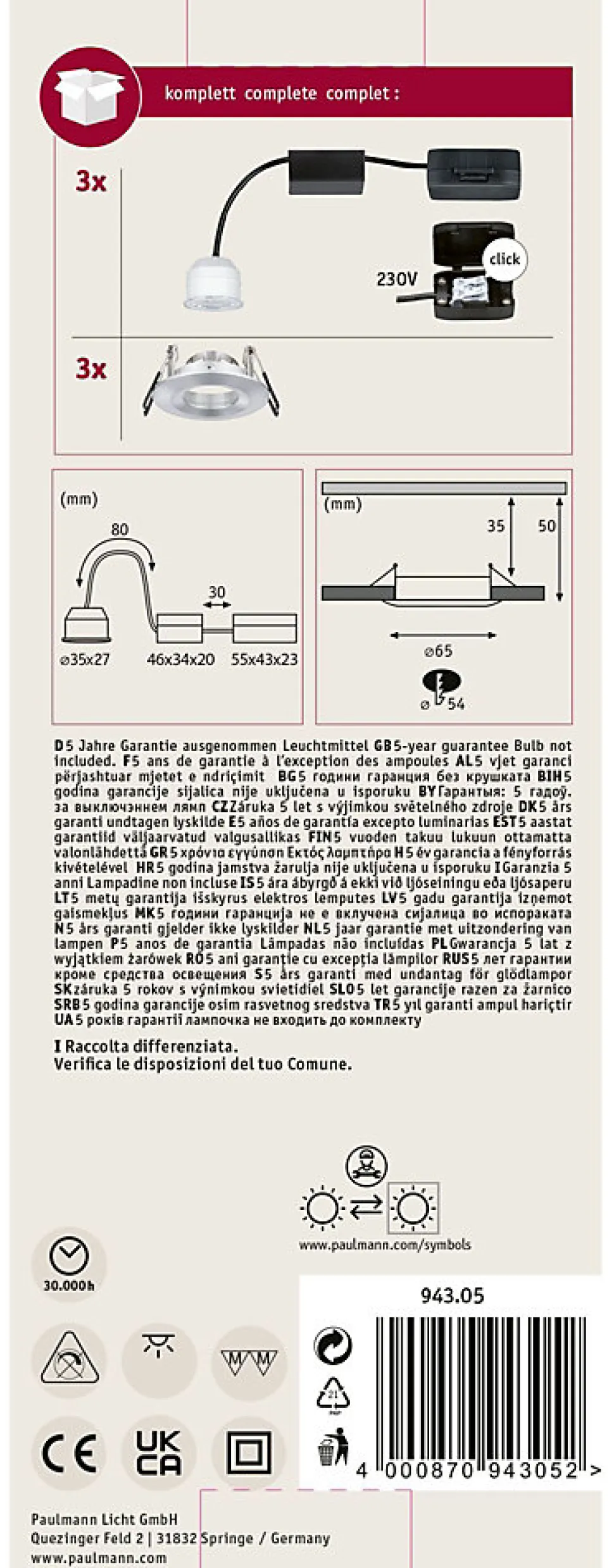 Kit composé de 3 luminaires fourni avec module LED|Température de couleur: 2700K – Blanc chaud|Pour raccordement direct au secteur 230V|Protection IP : IP44 – Protection contre les projections d’eau