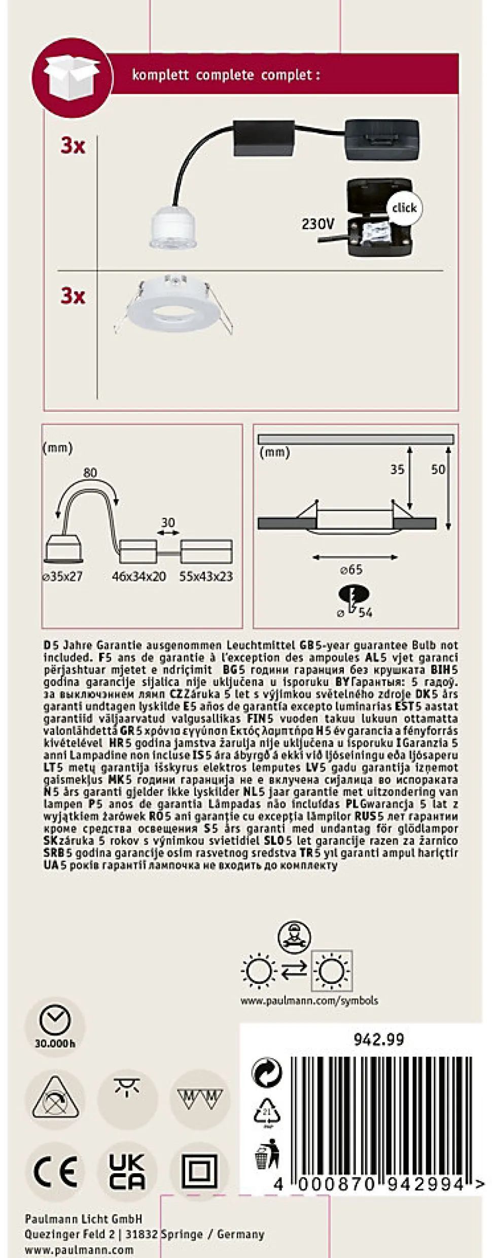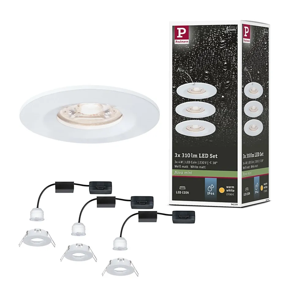 Kit composé de 3 luminaires fourni avec module LED|Température de couleur: 2700K – Blanc chaud|Pour raccordement direct au secteur 230V|Protection IP : IP44 – Protection contre les projections d’eau