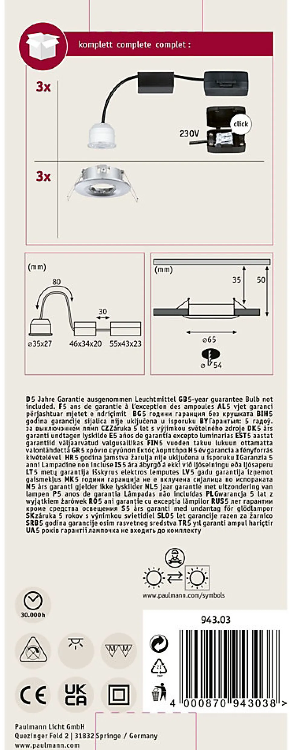 Kit composé de 3 luminaires fourni avec module LED|Température de couleur: 2700K – Blanc chaud|Pour raccordement direct au secteur 230V|Protection IP : IP44 – Protection contre les projections d’eau