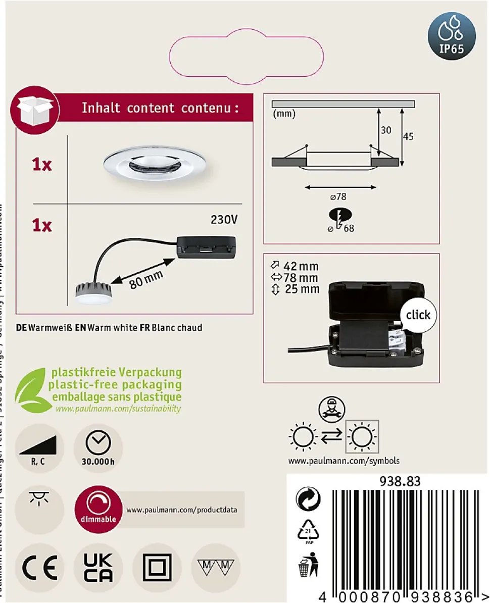 Le spot encastré Nova Plus rond en Chrome avec LED-Coin remplaçable convient aussi bien à l’équipement de nouvelles installations qu’au remplacement d’équipements existants. De forme particulièrement plate, il s’intègre dans les plafonds disposant d’un espace creux de 30 mm seulement. Grâce à un raccordement par clips de fixation rapides, les luminaires individuels sont simples et rapides à monter. Leur variateur d’intensité permet un ajustement individuel de la luminosité offrant deux effets majeurs : vous jouissez d’une lumière de travail blanc chaud tout en baignant dans une ambiance cocooning. Avec la protection IP65, le luminaire est spécifiquement préservé de la pénétration des jets d’eau et convient donc parfaitement pour les locaux humides ou l’extérieur.
