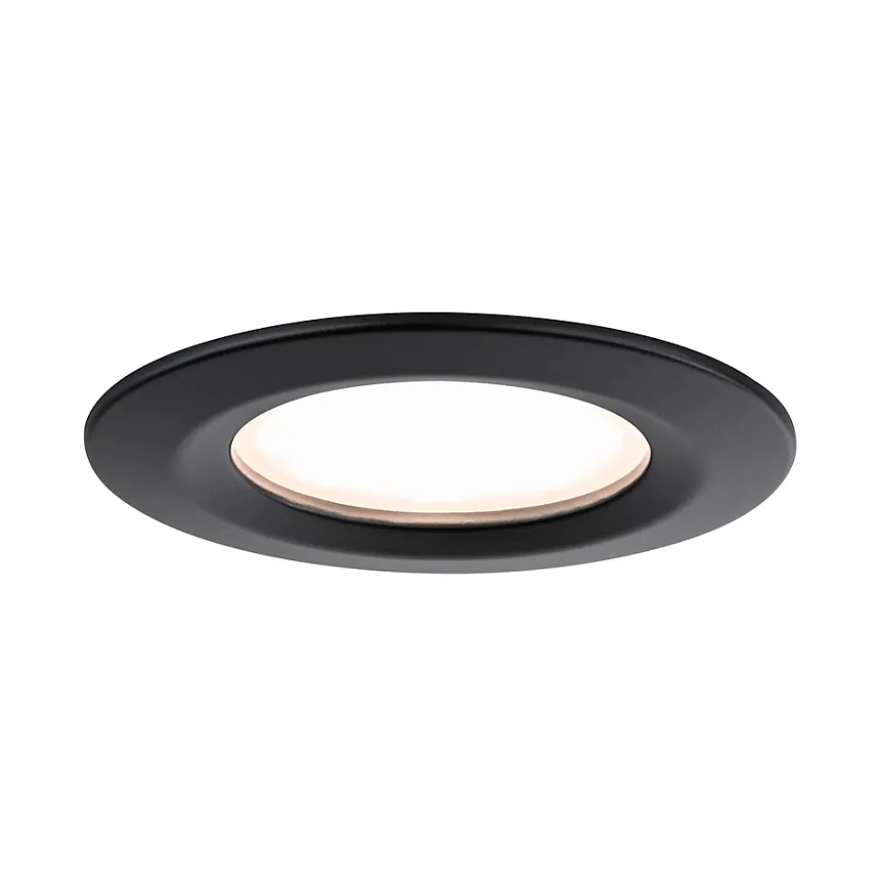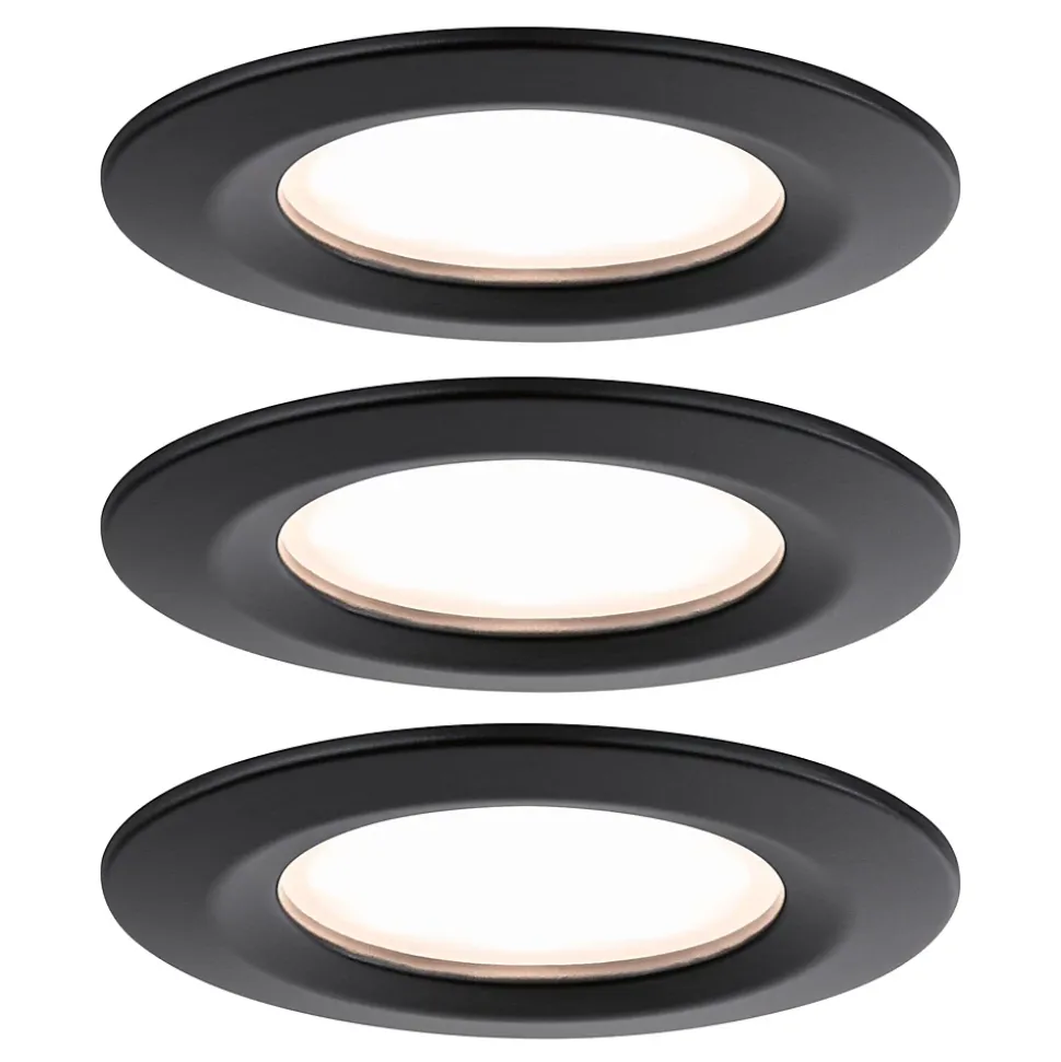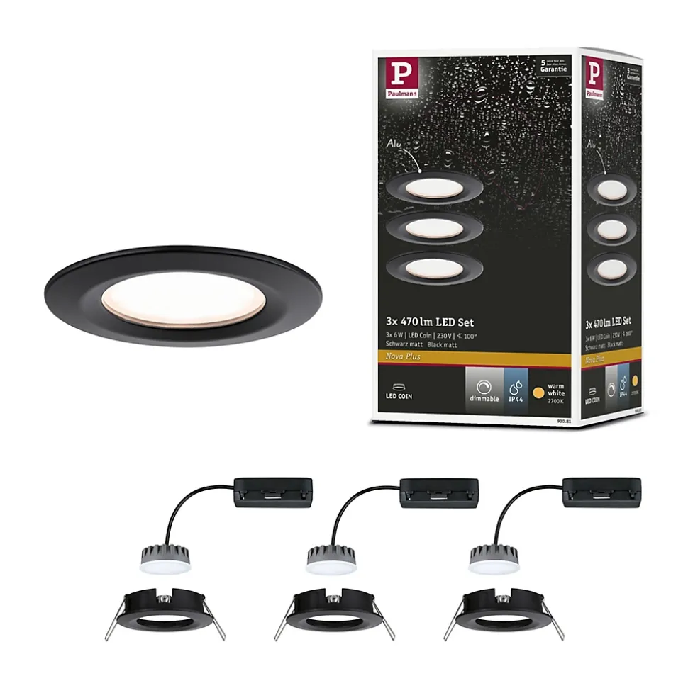 Les spots encastrés Nova Plus ronds en (kit de 3) en Noir mat avec LED-Coin remplaçable, conviennent aussi bien à l’équipement de nouvelles installations qu’au remplacement d’équipements existants. De forme particulièrement plate, ils s’intègrent dans les plafonds disposant d’un espace creux de 30 mm seulement. Grâce à un raccordement par clips de fixation rapides, les luminaires individuels sont simples et rapides à monter. Leur variateur d’intensité permet un ajustement individuel de la luminosité offrant deux effets majeurs : vous jouissez d’une lumière de travail blanc chaud tout en baignant dans une ambiance cocooning. Avec leur protection anti-projections d’eau IP44, ces luminaires garantissent une lumière chaleureuse tant dans la salle de bain que dans la cuisine.