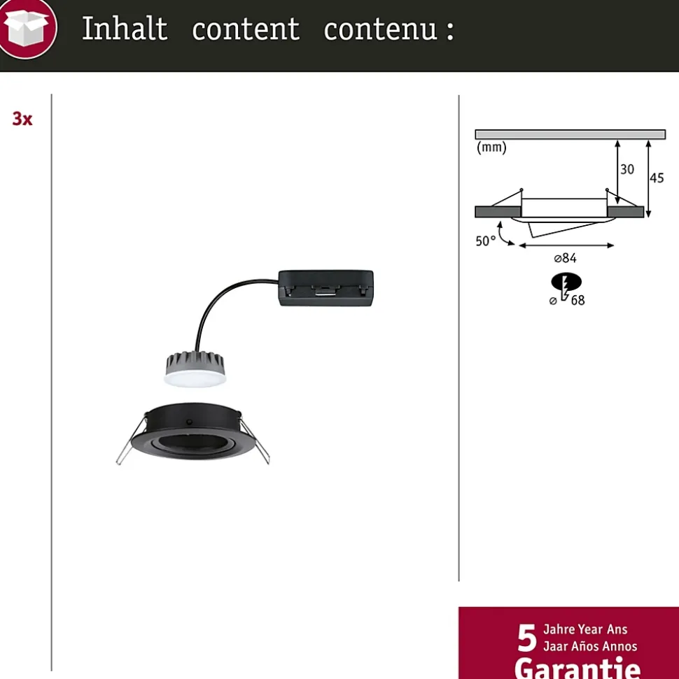 Kit composé de 3 luminaires fourni avec module LED|Température de couleur: 2700K – Blanc chaud|Avec verre de protection satiné|Très plat : le montage peut s’effectuer même avec une faible profondeur de la cavité de seulement 30 mm.|Pour raccordement direct au secteur 230V|Protection IP : IP44 – Protection contre les projections d’eau|Intensité variable