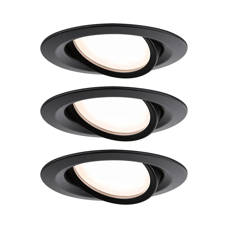 Les spots encastrés Nova Plus ronds en (kit de 3) en Noir mat avec LED-Coin remplaçable, conviennent aussi bien à l’équipement de nouvelles installations qu’au remplacement d’équipements existants. De forme particulièrement plate, ils s’intègrent dans les plafonds disposant d’un espace creux de 30 mm seulement. Grâce à un raccordement par clips de fixation rapides, les luminaires individuels sont simples et rapides à monter. Leur variateur d’intensité permet un ajustement individuel de la luminosité offrant deux effets majeurs : vous jouissez d’une lumière de travail blanc chaud tout en baignant dans une ambiance cocooning. Grâce à leur capacité de pivotement, les spots peuvent être orientés individuellement. Avec la protection IP65, les luminaires sont spécifiquement préservés de la pénétration des jets d’eau et conviennent donc parfaitement pour les locaux humides ou l’extérieur.