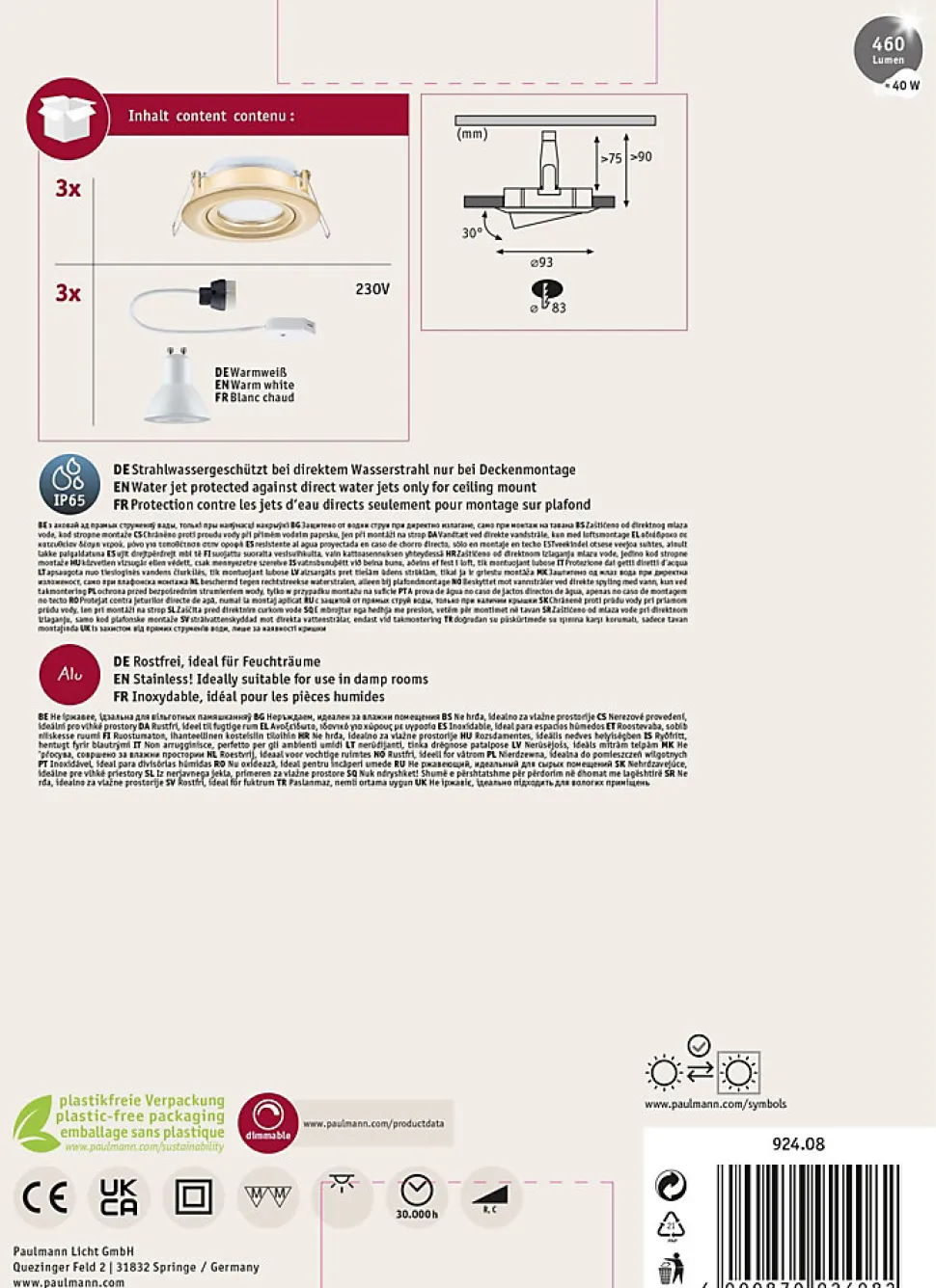 Kit de 3 luminaires|Avec des spots réglables pour un éclairage optimal|Ampoule LED amovible incluse|Température de couleur: 2700K – Blanc chaud|Matériau haut de gamme en alu moulé sous pression|Protection IP : IP65 – Protection contre les jets d’eau|Installation facile de l’ampoule sans circlip|Pour raccordement direct au secteur 230V
