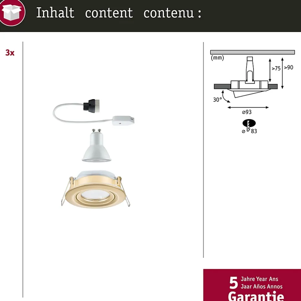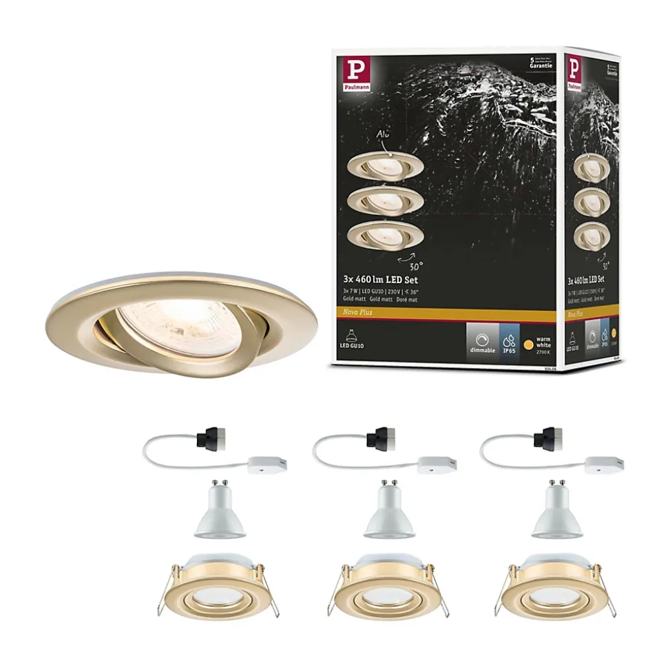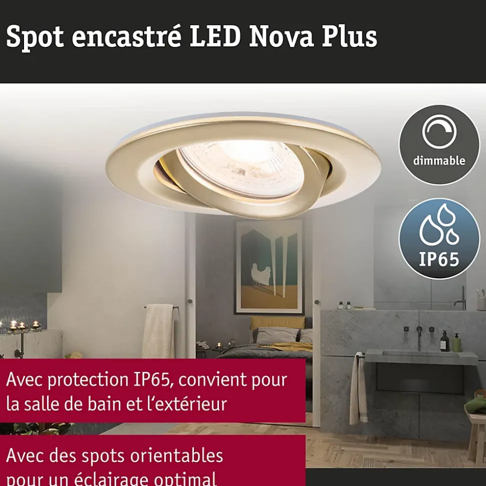 Le spot encastré Nova Plus rond (kit de 3) en Doré mat avec ampoule GU10 remplaçable convient aussi bien à l’équipement de nouvelles installations qu’au remplacement d’équipements existants. Ils s’intègrent dans les plafonds disposant d’un espace creux de 75 mm seulement. La fixation simple par ressorts de retenue laisse le plafond intact même après plusieurs montages et démontages. Leur variateur d’intensité permet un ajustement individuel de la luminosité offrant deux effets majeurs : vous jouissez d’une lumière de travail blanc chaud tout en baignant dans une ambiance cocooning. Avec la protection IP65, le luminaire est spécifiquement préservé de la pénétration des jets d’eau et convient donc parfaitement pour les locaux humides ou l’extérieur.