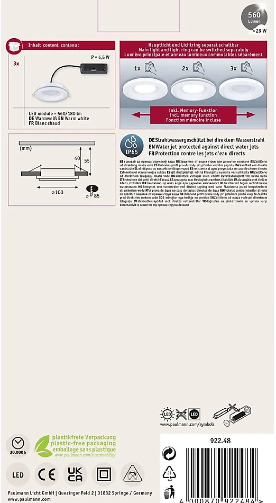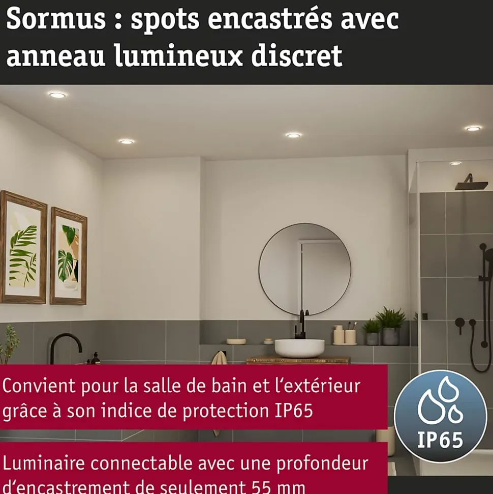 Kit de spots encastrés Sormus à 560 lm|Commande d’éclairage individuelle sur trois niveaux (gradable)|Un éclairage lumineux ou des accents lumineux décoratifs pour l’éclairage de la salle de bains|Température de couleur: 3000K – Blanc chaud|Protection IP : IP65 – Protection contre les jets d’eau|La fonction de mémoire enregistre le dernier niveau utilisé jusqu’à la prochaine mise en marche.|Geringe Einbautiefe|Montage simple et flexible grâce à la conception enchaînable