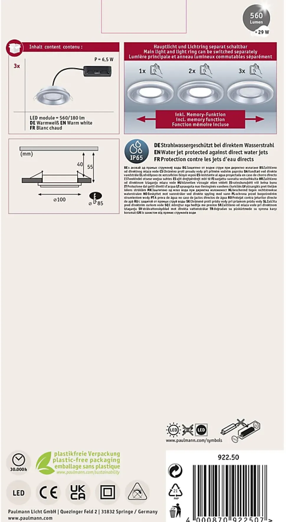 Kit de spots encastrés Sormus à 560 lm|Commande d’éclairage individuelle sur trois niveaux (gradable)|Un éclairage lumineux ou des accents lumineux décoratifs pour l’éclairage de la salle de bains|Température de couleur: 3000K – Blanc chaud|Protection IP : IP65 – Protection contre les jets d’eau|La fonction de mémoire enregistre le dernier niveau utilisé jusqu’à la prochaine mise en marche.|Geringe Einbautiefe|Montage simple et flexible grâce à la conception enchaînable