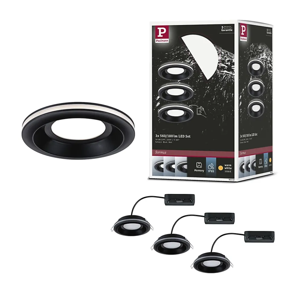 Kit de spots encastrés Sormus à 560 lm|Commande d’éclairage individuelle sur trois niveaux (gradable)|Un éclairage lumineux ou des accents lumineux décoratifs pour l’éclairage de la salle de bains|Température de couleur: 3000K – Blanc chaud|Protection IP : IP65 – Protection contre les jets d’eau|La fonction de mémoire enregistre le dernier niveau utilisé jusqu’à la prochaine mise en marche.|Geringe Einbautiefe|Montage simple et flexible grâce à la conception enchaînable