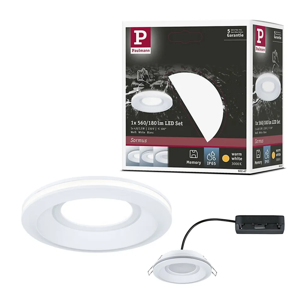 Kit de spots encastrés Sormus à 560 lm|Commande d’éclairage individuelle sur trois niveaux (gradable)|Un éclairage lumineux ou des accents lumineux décoratifs pour l’éclairage de la salle de bains|Température de couleur: 3000K – Blanc chaud|Protection IP : IP65 – Protection contre les jets d’eau|La fonction de mémoire enregistre le dernier niveau utilisé jusqu’à la prochaine mise en marche.|Geringe Einbautiefe|Montage simple et flexible grâce à la conception enchaînable