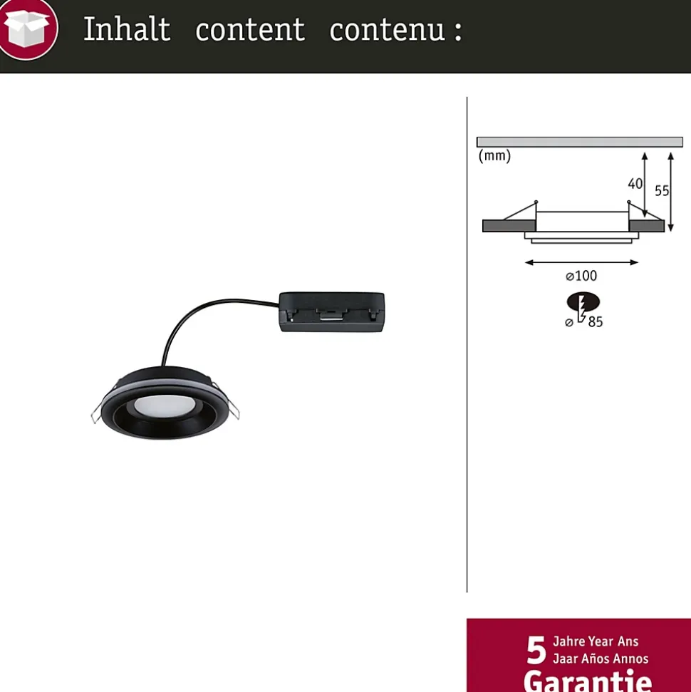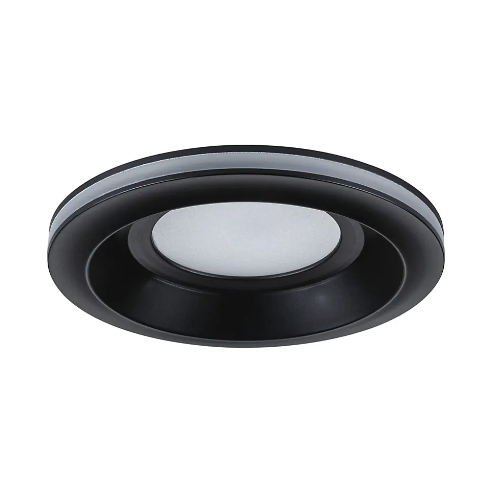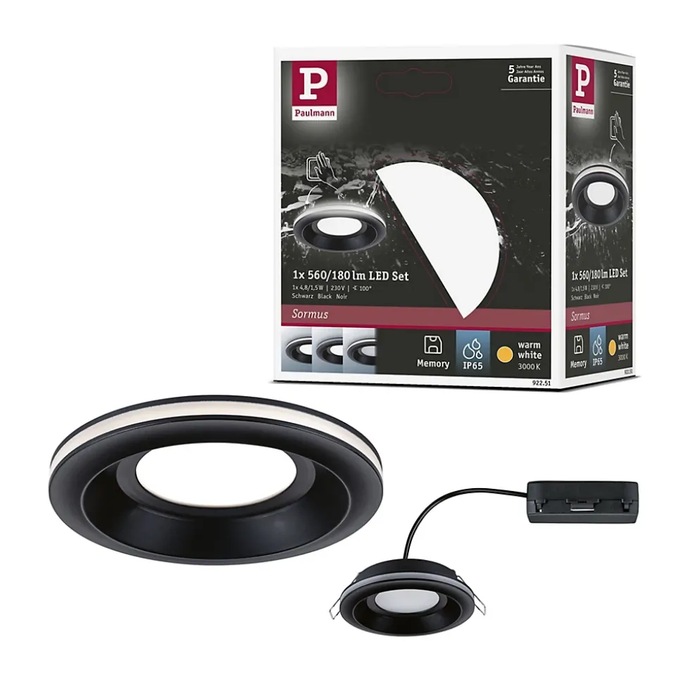 Le kit de spots encastrés Sormus en Noir est la solution idéale pour créer une ambiance lumineuse dans la salle de bains, où la fonctionnalité s’allie au design moderne. Avec la protection IP65, le luminaire est préservé de la pénétration des jets d’eau et convient donc parfaitement pour les locaux humides ou l’extérieur. La diffusion lumineuse extra-large assure un éclairage lumineux qui, avec une température de couleur de 3000 K, plonge la pièce dans une couleur de feu blanc chaud. L’un des points forts du spot encastré Sormus est sa commande d’éclairage flexible, qui permet de choisir entre un éclairage lumineux de la salle de bains et des accents lumineux décoratifs. En appuyant plusieurs fois sur un interrupteur conventionnel, vous pouvez choisir entre un éclairage principale, un anneau décoratif éclairé ou une combinaison des deux. Le spot encastré Sormus présente une profondeur d’encastrement d’à peine 55 mm, ce qui permet de l’installer dans des faux plafonds peu profonds. Le boîtier de raccordement pratique permet un raccordement direct en 230 V et permet de raccorder les luminaires entre eux très facilement et sans restriction.