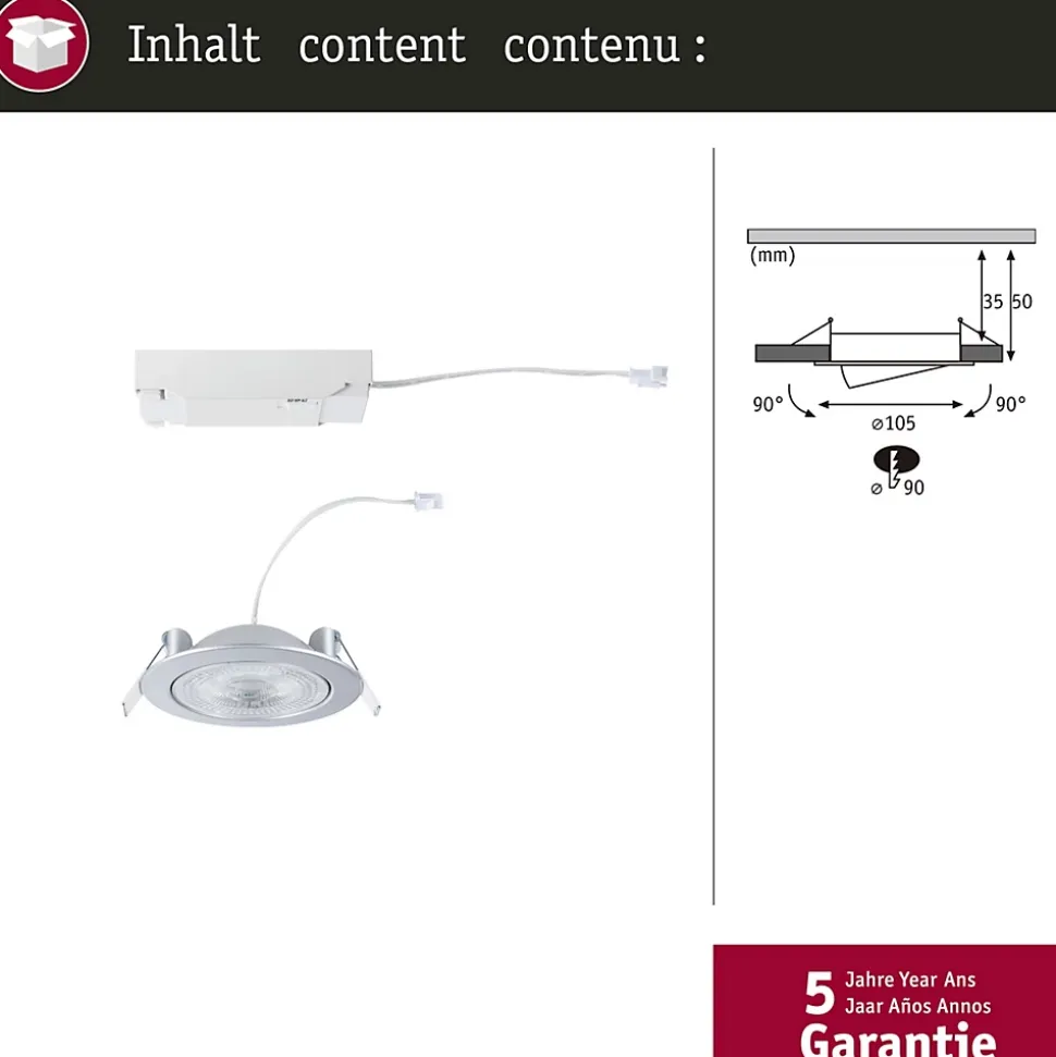 Un design attrayant et une technologie innovante pour des solutions d’éclairage efficaces|Faible profondeur de cavité de max. 50 mm|Un simple commutateur permet de faire varier la luminosité sur 3 niveaux|Montage sans outil en quelques secondes|Perfect for rooms needing flexible illumination options|Capacité de pivotement jusqu’à 180° pour des réglages d’éclairage personnalisés|Fonction White Select pour un choix individuel de la température de couleur (2700 K, 4000 K, 6500 K) avant l’installation