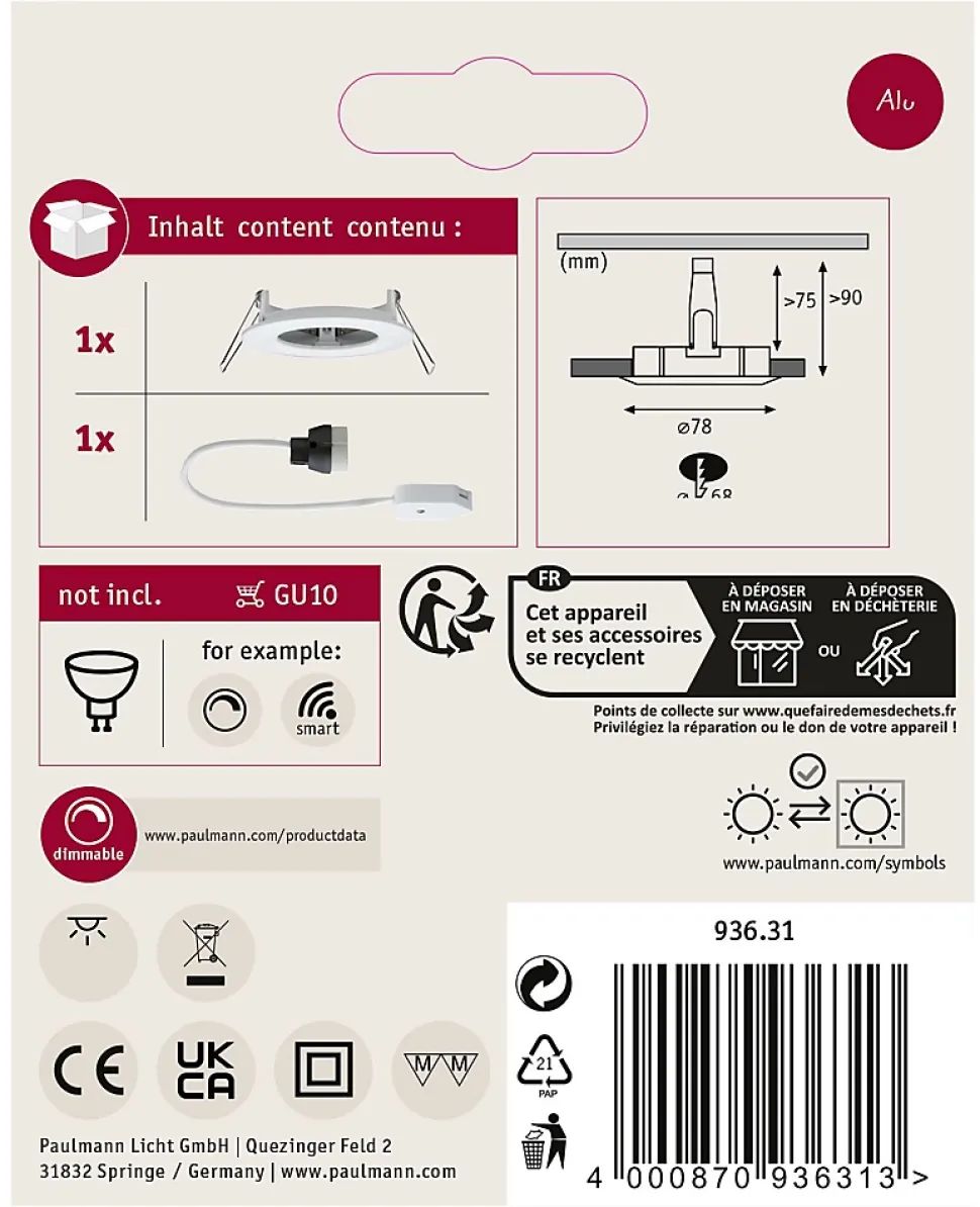 Avec leur design moderne, les spots encastrés Nova s’intègrent à tout type d’habitat. Le choix de l’ampoule vous revient. Optez pour le réflecteur que vous souhaitez avec un culot GU10 et une puissance maximale de 35 watts. Ils s’installent facilement à l’intérieur de la bague de montage grâce à un bornier – nullement besoin de circlip. Selon l’ampoule utilisée, la lampe est dimmable.