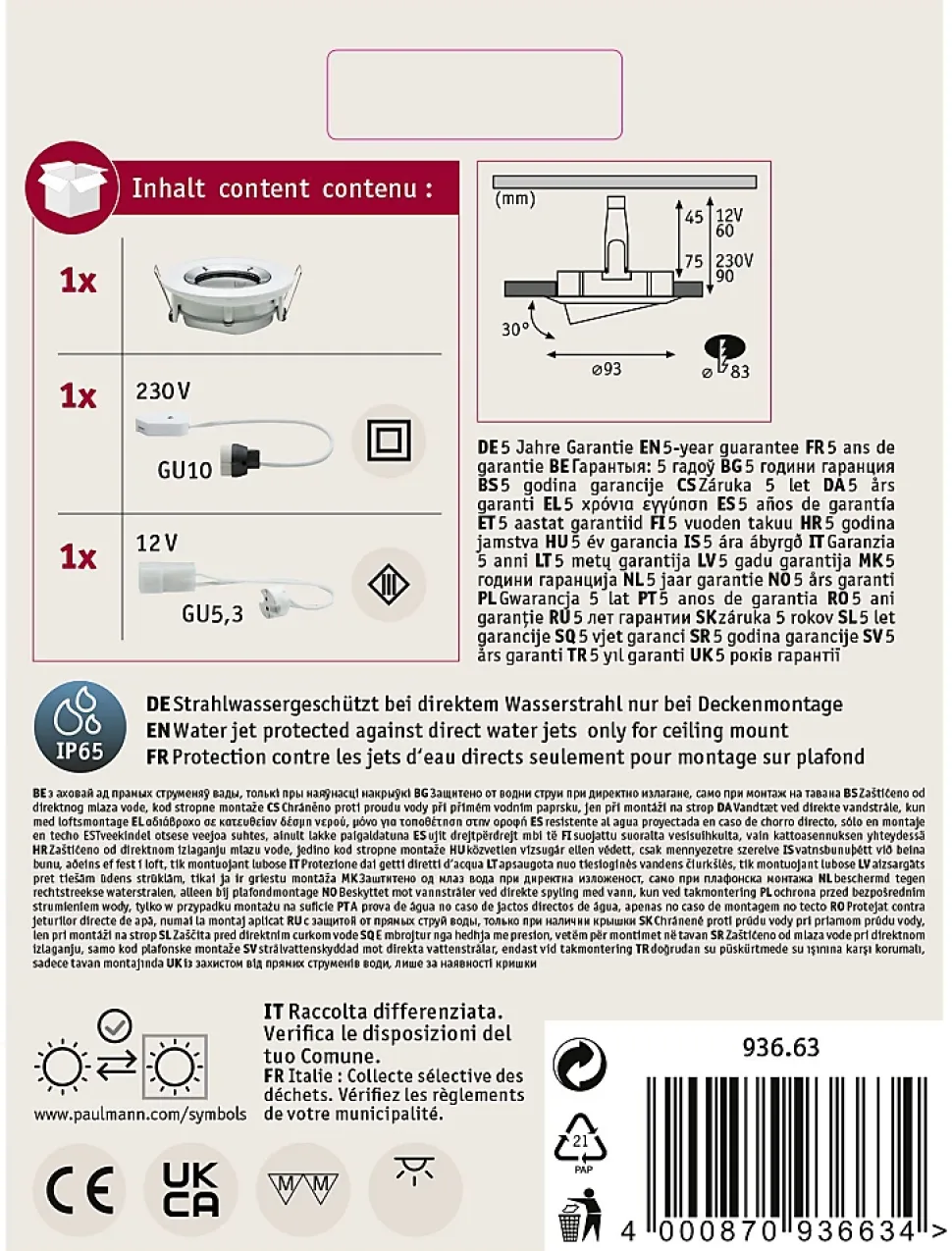 Le spot encastré Nova Plus rond en Blanc dépoli, Chrome convient aussi bien à l’équipement de nouvelles installations qu’au remplacement d’équipements existants. Il s’intègre dans les plafonds disposant d’un espace creux de 75 mm seulement. La fixation simple par ressorts de retenue laisse le plafond intact même après plusieurs montages et démontages. Leur variateur d’intensité permet un ajustement individuel de la luminosité offrant deux effets majeurs : vous jouissez d’une lumière de travail blanc chaud tout en baignant dans une ambiance cocooning. Grâce à sa capacité de pivotement, le spot peut être orienté individuellement. Avec la protection IP65, le luminaire est spécifiquement préservé de la pénétration des jets d’eau et convient donc parfaitement pour les locaux humides ou l’extérieur. Les ampoules vendues séparément s’installent facilement à l’intérieur de la bague de montage grâce à un bornier – nul besoin de circlip. Selon l’ampoule utilisée, la lampe est dimmable.