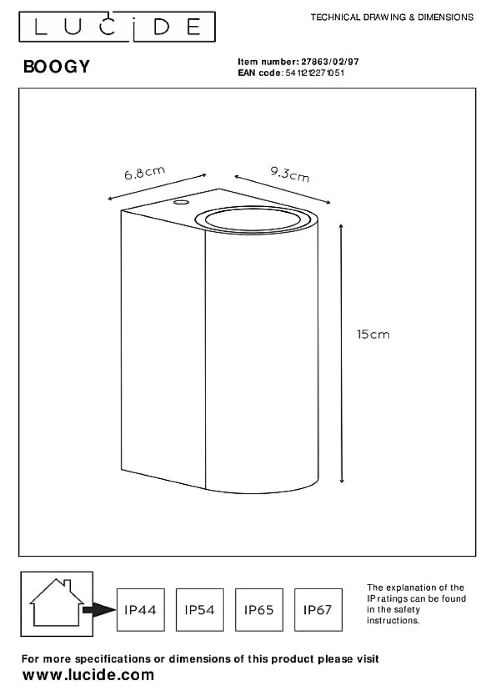 Une applique murale discrète pour une utilisation extérieure qui offre des performances exceptionnelles. Voici Boogy. Cet éclairage d’extérieur mesure seulement 15 centimètres de haut et saura donc parfaitement se marier à son environnement. La version brune est très élégante et saura facilement s’adapter à un décor moderne. Cette murale fera sensation surtout sur les murs ou les façades sombres. Ou optez pour le contraste: installez Boogy sur une façade ou un mur plâtré pâle. Boogy diffuse sa lumière sur deux côtés: en haut et en bas, ou à gauche et à droite.Caractéristiques uniques:• Utilisable avec des sources lumineuses LED• Facile à connecter à un variateur (non fourni)• Fabriqué en aluminiumPrincipales caractéristiques du produit:• Dessiné spécialement pour une utilisation fiable et de longue durée à l’extérieur (IP44)• Consommation énergétique: 2x5W / 230V / A intensité variable (Ampoules non incluses)• Dimensions: Lon.6,8 x Larg.9,3 x Haut.15 cm• 2 Ans garantie sur le luminaire / source de lumière appropriée est EAN: 5411212490643Pourquoi choisir l’éclairage Lucide?Lucide incarne un design innovant, un savoir-faire artisanal et une fiabilité exemplaire. En tant qu’entreprise familiale belge avec plus de trois décennies d’expertise, nous concevons des éclairages de haute qualité qui enrichissent et transforment chaque espace, tant intérieur qu’extérieur. Notre collection polyvalente comprend des luminaires durables et des sources lumineuses économes en énergie, soigneusement conçus par nos propres experts et fabriqués selon les normes CE les plus strictes. Grâce à notre large gamme, nous vous proposons toujours une solution d’éclairage adaptée, quel que soit le style ou l’espace. Ainsi, nous illuminons non seulement votre espace de vie mais aussi votre processus de choix dans la recherche d’un éclairage de qualité et abordable. Chez Lucide, nous combinons innovation et savoir-f…