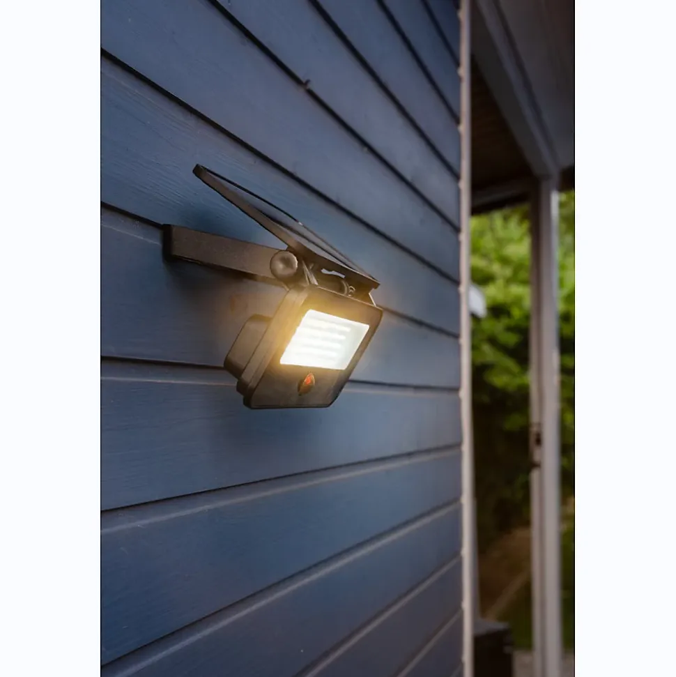 Projecteur mural extérieur solaire GALIX G2610 : boîtier aluminium et diffuseur en verre, 48 LED SMD 2835, 3 niveaux de luminosité (1200/600/250 lm) et sélection de température (chaud/mixt/froid), capteur PIR intégré (jusqu’à 3 m, 120°) avec délai 30 s, batterie rechargeable 1×18650 2600 mAh, panneau solaire inclinable, fixation murale fournie, garantie 24 mois.