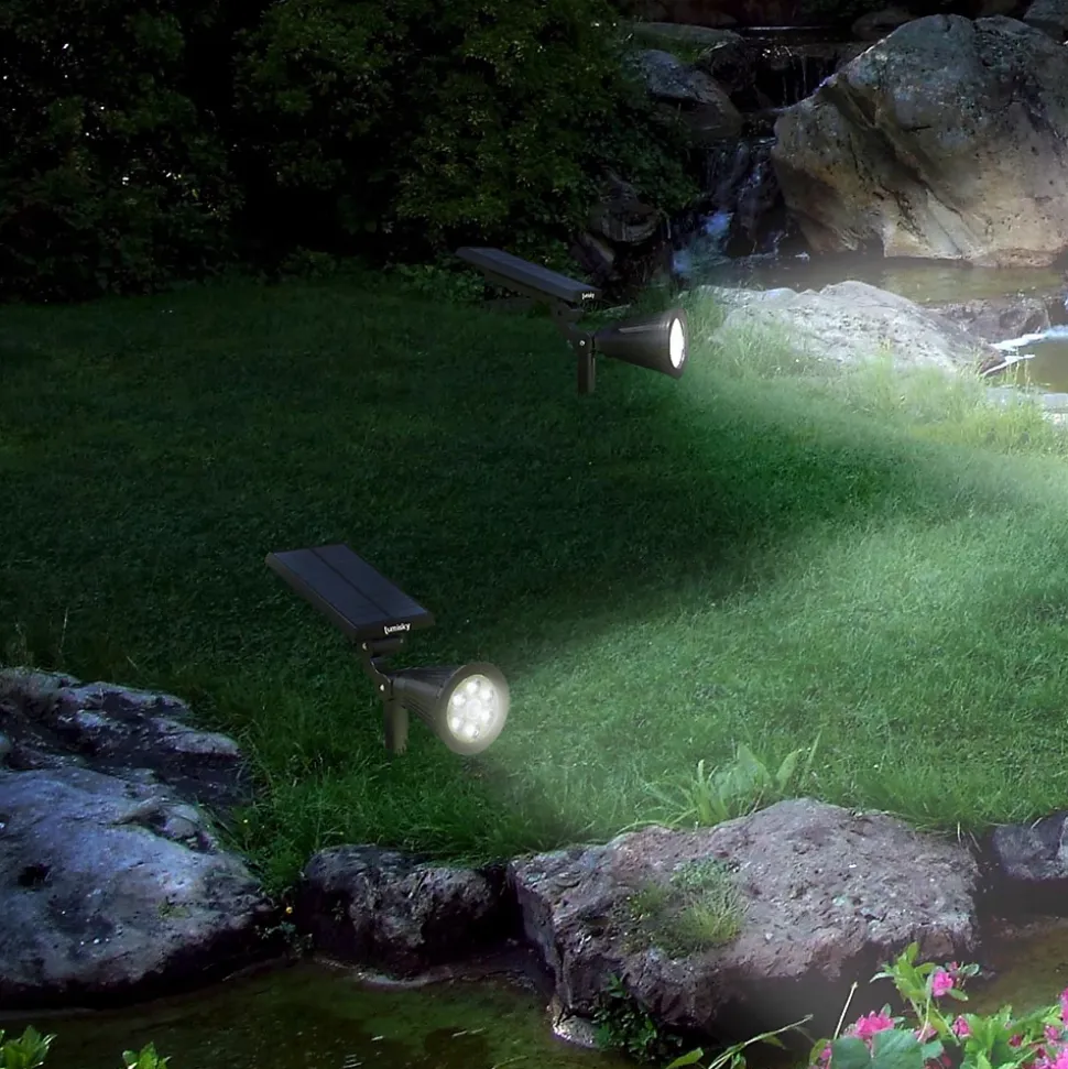 - Projecteur solaire étanche LUMISKY avec 4 LEDs blanches délivrant 200 lm pour éclairage d’accentuation extérieur.