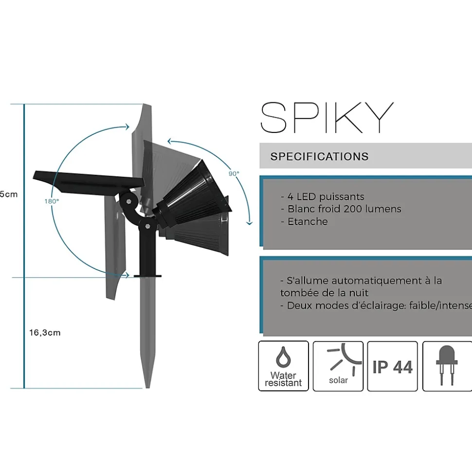 Le spot solaire LED Spiky W34 offre un éclairage extérieur blanc froid au design épuré avec une autonomie technique de 12 heures. Ce luminaire autonome est idéal pour structurer votre jardin, éclairer une terrasse ou baliser une allée avec un flux lumineux supérieur à 100 lumens à intensité variable. Sa batterie se recharge en 6 à 8 heures d’ensoleillement pour garantir une performance nocturne constante. D’une hauteur de 42 cm pour un diamètre de 10 cm, il est certifié IP44 pour résister aux éclaboussures et aux rayons UV, assurant une solidité idéale face aux conditions climatiques variées. Son entretien est facilité par un nettoyage simple à l’eau savonneuse. Pour un effet encore plus chaleureux, combinez-la avec d’autres sources de lumière et variez les hauteurs d’installation. Parfaite pour les repas en plein air, les apéritifs ou les soirées d’été, elle crée immédiatement une ambiance douce et.