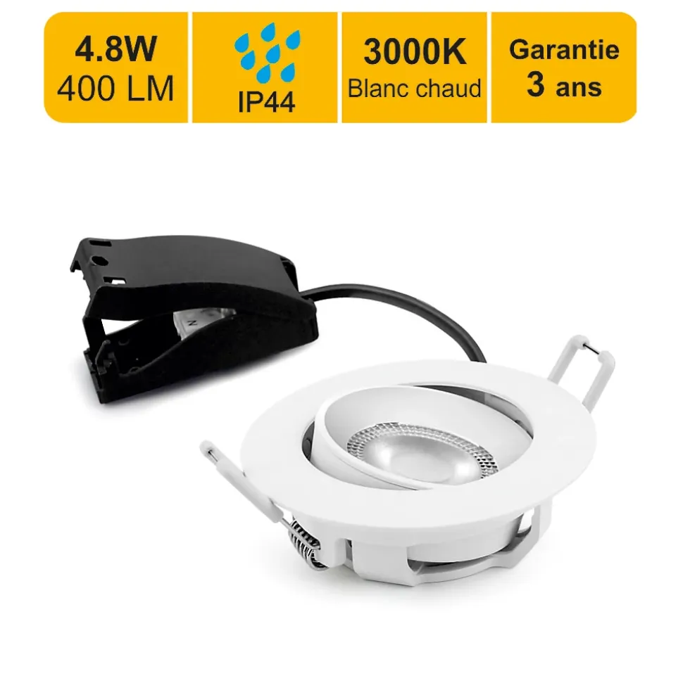 Éclairez votre salle de bain avec élégance et efficacité ! Ces spot sLED encastrable 4,8W offrent une lumière agréable de 400 lm en blanc chaud (3000K) et constituent une alternative économique et performante aux anciens spots halogènes de 40W.Un éclairage adapté aux environnements humidesSon indice de protection IP44 leur permet d’être installé en salle de bain et pièce d’eau (hors volume 1), garantissant une résistance à l’humidité et aux projections d’eau.Installation rapide et encombrement réduitFaible profondeur d’encastrement (30 mm), idéal pour les faux plafonds avec peu d’espaceBoîtier de connexion déporté avec connecteur rapide et traversant, permettant une installation en sérieOrientable à 30°, pour un éclairage ajustable selon vos besoinsLumière homogène et économie d’énergieSon angle de diffusion de 36° assure un éclairage ciblé et homogène. Grâce à sa LED intégrée, il consomme jusqu’à 90% d’énergie en moins qu’un spot halogène tout en offrant une longue durée de vie (15 000 heures).Caractéristiques techniques :Puissance réelle : 4.8WFlux lumineux : 400 lm (83 lm/W)Ancienne norme 2012 : A+Nouvelle norme 2021 : FTempérature de couleur : Blanc chaud (3000K)Indice de protection : IP44 (parfait pour zones humides hors zone 1)Durée de vie : 15 000 heuresAngle de diffusion : 36°Dimensions : 87×30 mm (perçage 68 mm)Tension : 220-240VGarantie : 3 ansNormes : CE, ROHS, EMCRemplacementCe spot n’est pas compatible avec les installations contenant de la laine de verre.Si vous remplacez des ampoules MR16, retirer les tranformateurs et brancher en 230V
