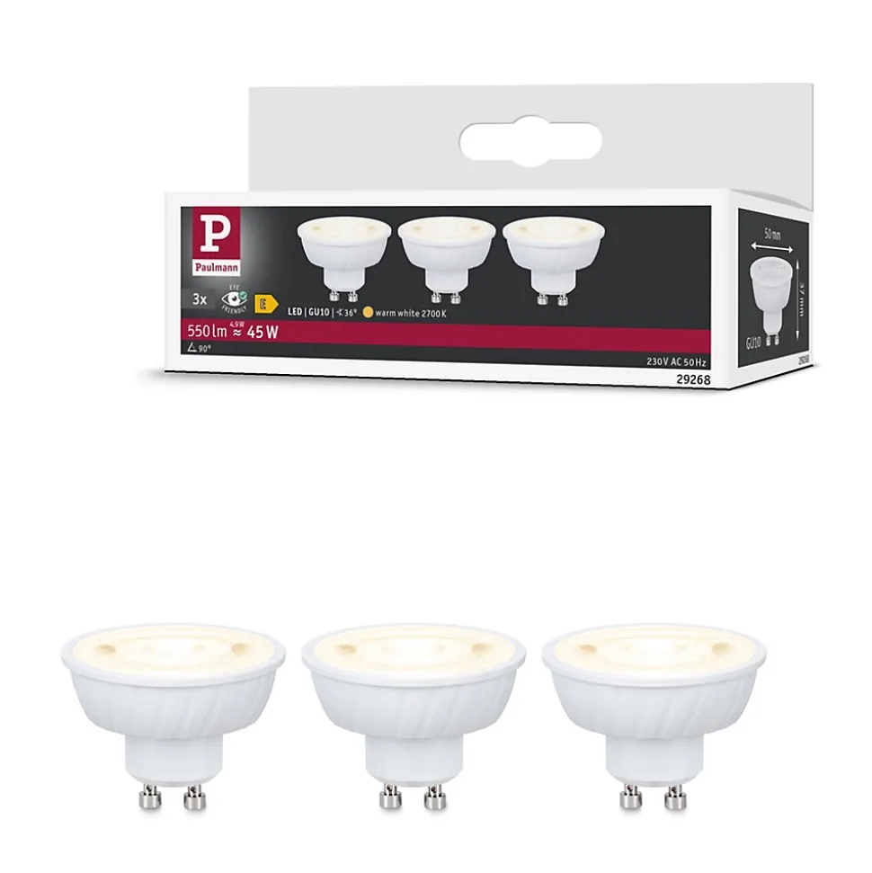 Ces ampoules GU10 blanc chaud de 2700 K, d’une puissance de 4,9 W et de 550 lm se distinguent par leur hauteur d’encastrement particulièrement faible de seulement 37 mm et sont idéales pour les spots encastrés dans les faux plafonds. Les ampoules, proposées ici en set pratique de 3, s’adaptent à toutes les douilles GU10 disponibles dans le commerce et assurent, grâce à leur lentille bombée, un rendement en lumens plus élevé pour le même diamètre standard de 50 mm. Avec une durée de vie de 25 000 heures, les ampoules offrent une utilisation durable et fiable. Le rendu des couleurs de CRI ≥ 80 produit des couleurs naturelles et vives. Avec un angle de rayonnement de 36°, les lampes à réflecteur sont conçues pour produire une lumière dirigée dans les luminaires en suspension, Spots et les projecteurs. Dans l’ensemble, ces réflecteurs offrent non seulement une lumière de haute qualité avec une luminosité optimale, mais aussi de nombreuses possibilités d’aménagement des espaces par une accentuation ciblée. Les lampes LED de Paulmann, labellisées Eye friendly, offrent une lumière confortable qui ménage les yeux. Que ce soit pour travailler, lire ou se détendre, ces lampes contribuent à un confort visuel optimal.