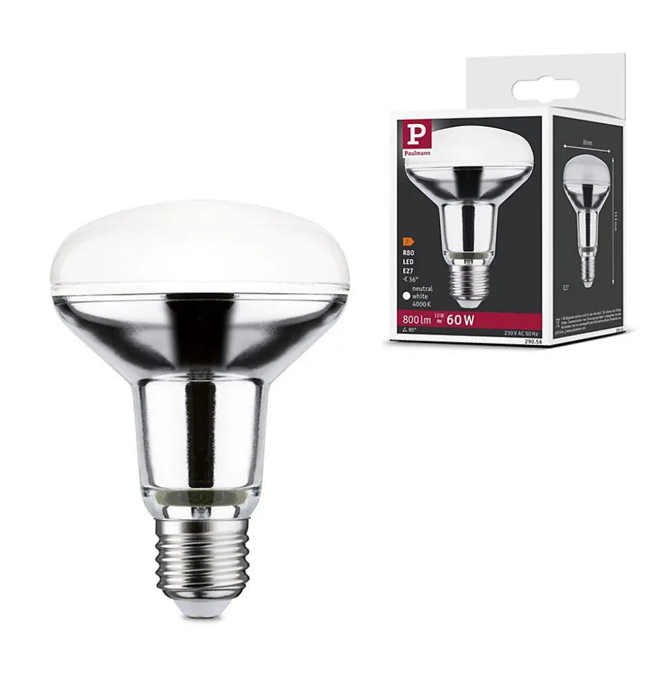 Le réflecteur en verre plein R80 avec 4000K, une puissance de 10W et 800lm fournit une lumière dirigée pour les luminaires en suspension, spots et projecteurs. L’ampoule est compatible avec les douilles E27 conventionnelles. Ils diffusent la lumière uniquement vers l’avant et mettent en valeur la décoration ou les murs entiers par un éclairage ciblé. Les lampes LED Paulmann portant le label Eye friendly produisent une lumière confortable qui préserve les yeux. Que ce soit pour travailler, lire ou se détendre, les lampes contribuent à un meilleur confort visuel.