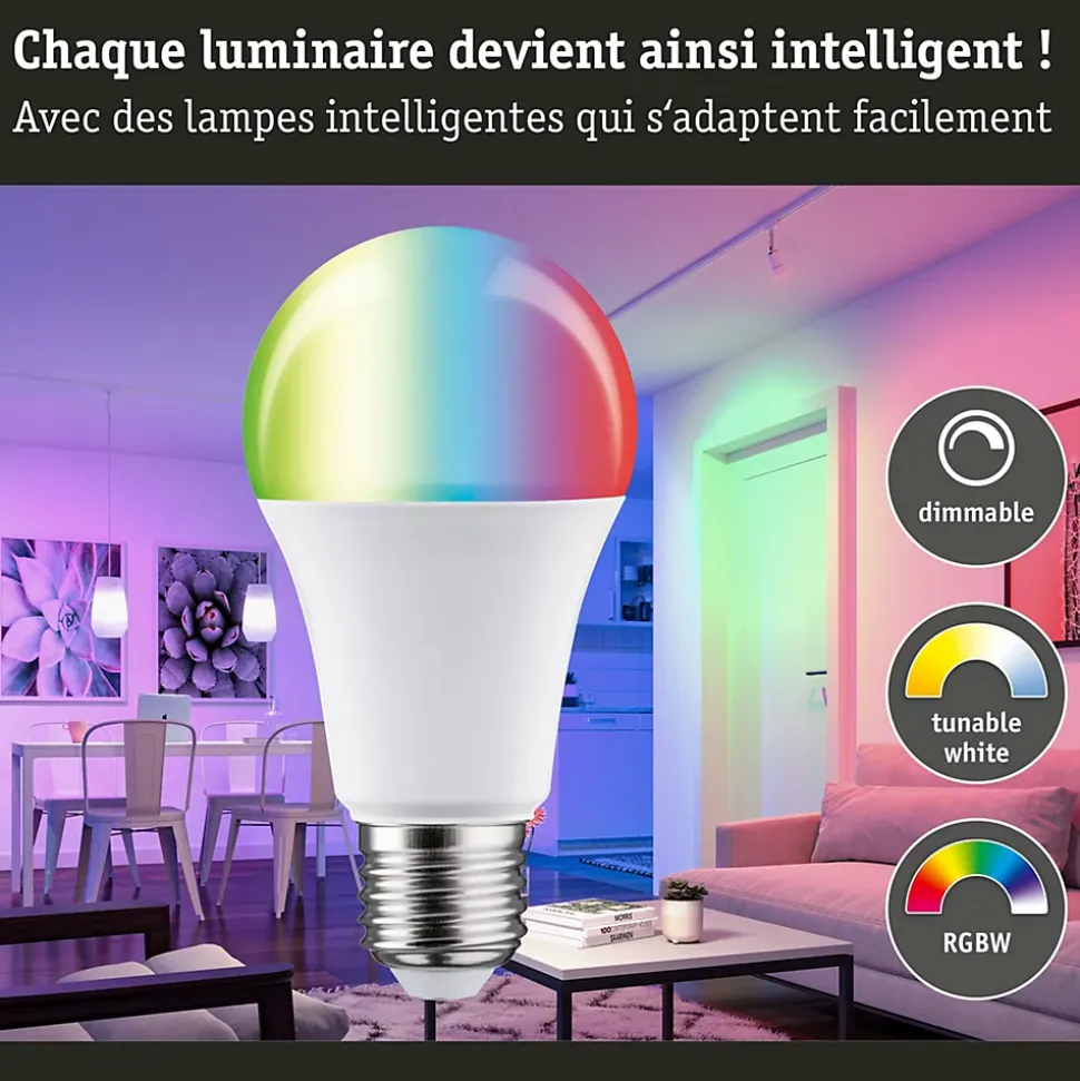 L’ampoule avec RGBW+, une puissance de 11W et 1055lm diffuse un éclairage uniforme agréable. L’ampoule est compatible avec les douilles E27 conventionnelles. L’ampoule est compatible Zigbee 3.0 3.0. ZigBee est un protocole de transmission radio qui met en réseau les appareils de différents fabricants. Selon l’ambiance désirée, vous pouvez choisir entre un blanc chaud véritable, une lumière colorée et d’autres effets différents. Les lampes LED Paulmann portant le label Eye friendly produisent une lumière confortable qui préserve les yeux. Que ce soit pour travailler, lire ou se détendre, les lampes contribuent à un meilleur confort visuel.