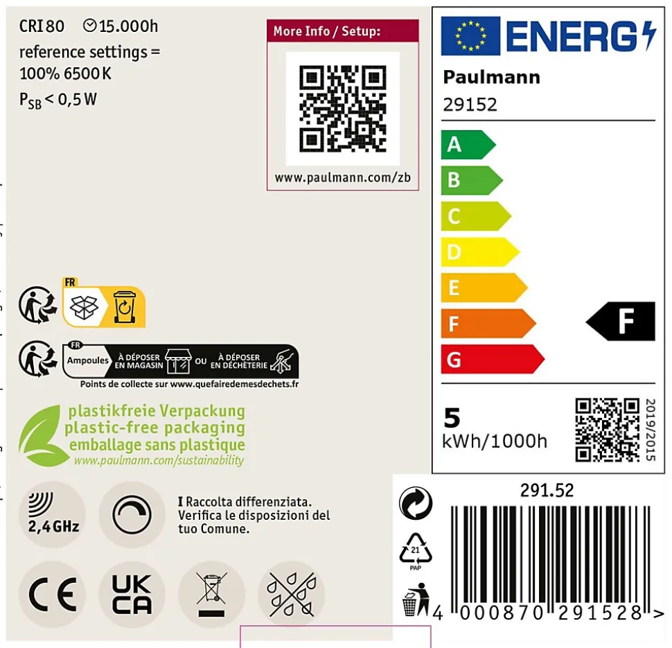 L’ampoule en forme de bougie (lot de 3) avec RGBW+, une puissance de 3x5W et 3x470lm diffuse un éclairage uniforme agréable. L’ampoule est compatible avec les douilles E14 conventionnelles. L’ampoule est compatible Zigbee 3.0 3.0. ZigBee est un protocole de transmission radio qui met en réseau les appareils de différents fabricants. Selon l’ambiance désirée, vous pouvez choisir entre un blanc chaud véritable, une lumière colorée et d’autres effets différents. Les lampes LED Paulmann portant le label Eye friendly produisent une lumière confortable qui préserve les yeux. Que ce soit pour travailler, lire ou se détendre, les lampes contribuent à un meilleur confort visuel.