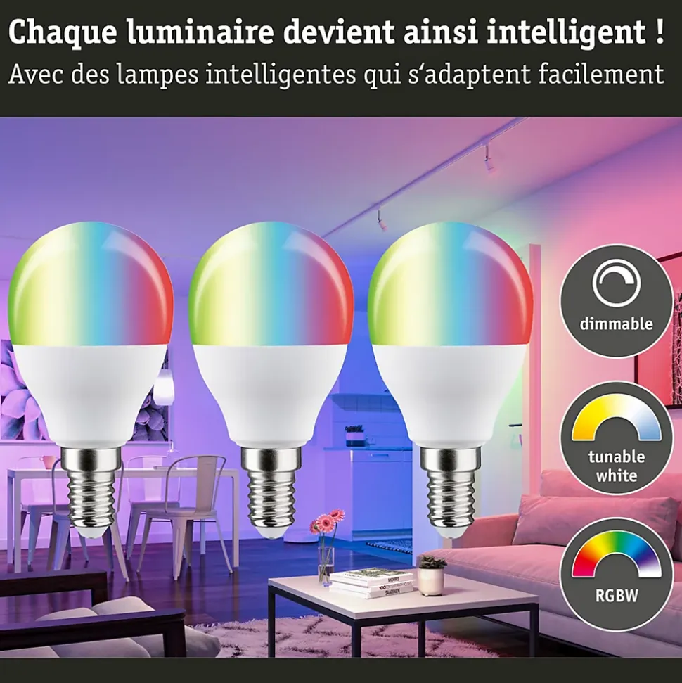 L’ampoule sphérique (lot de 3) avec RGBW+, une puissance de 3x5W et 3x470lm diffuse un éclairage uniforme agréable. L’ampoule est compatible avec les douilles E14 conventionnelles. L’ampoule est compatible Zigbee 3.0 3.0. ZigBee est un protocole de transmission radio qui met en réseau les appareils de différents fabricants. Selon l’ambiance désirée, vous pouvez choisir entre un blanc chaud véritable, une lumière colorée et d’autres effets différents. Les lampes LED Paulmann portant le label Eye friendly produisent une lumière confortable qui préserve les yeux. Que ce soit pour travailler, lire ou se détendre, les lampes contribuent à un meilleur confort visuel.