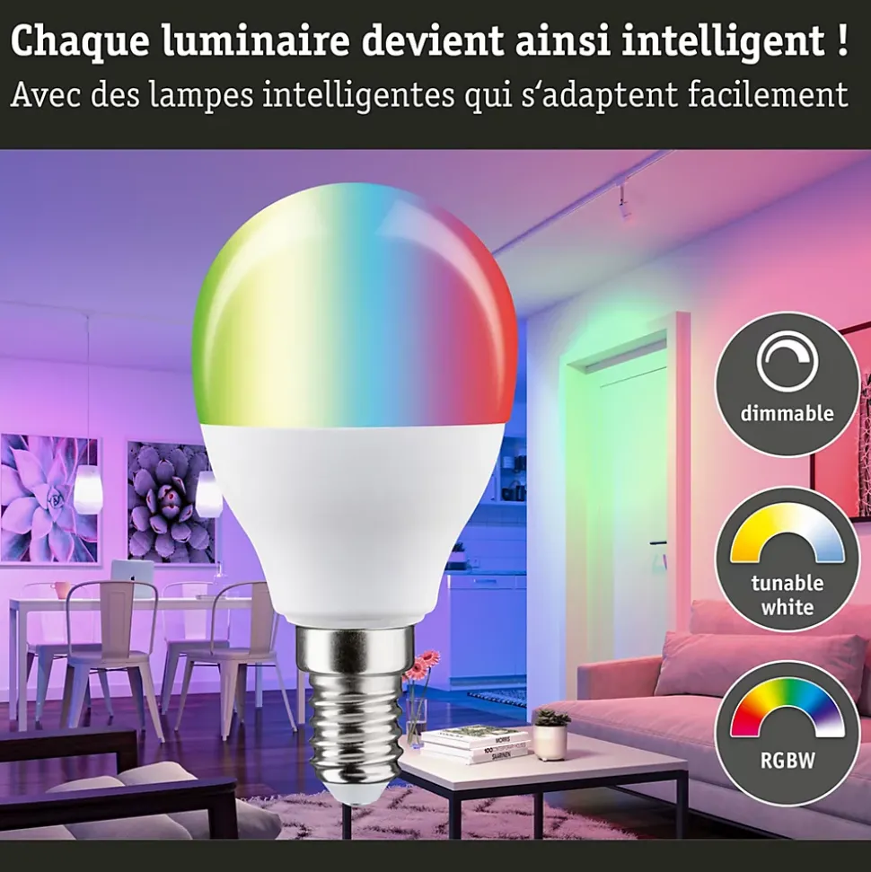 L’ampoule sphérique avec RGBW+, une puissance de 5W et 470lm diffuse un éclairage uniforme agréable. L’ampoule est compatible avec les douilles E14 conventionnelles. L’ampoule est compatible Zigbee 3.0 3.0. ZigBee est un protocole de transmission radio qui met en réseau les appareils de différents fabricants. Selon l’ambiance désirée, vous pouvez choisir entre un blanc chaud véritable, une lumière colorée et d’autres effets différents. Les lampes LED Paulmann portant le label Eye friendly produisent une lumière confortable qui préserve les yeux. Que ce soit pour travailler, lire ou se détendre, les lampes contribuent à un meilleur confort visuel.