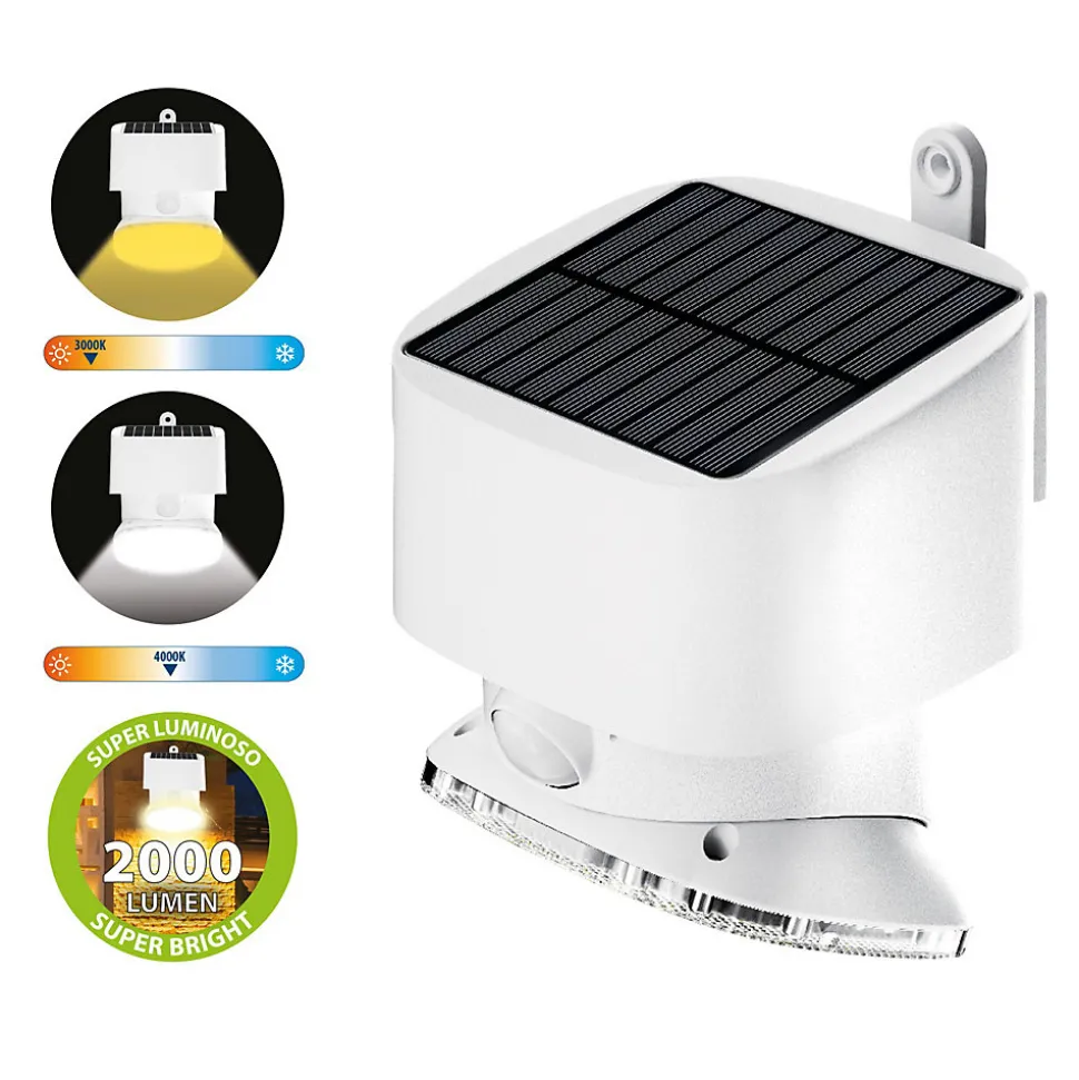 Spot Mural LED Solaire : Classique, simple, beau. Lampe solaire d’extérieur LED 2000 lumens avec détecteur de mouvement. Lumière compacte et orientable : éclaire tous les recoins ! La lampe embarque des LED SMD de dernière génération avec diffuseur haute performance : la lumière est homogène ; lumière 4000K : ni trop chaude ni trop froide.Lampe solaire : Cette lampe solaire avec détecteur de mouvement se recharge le jour grâce à l’énergie solaire et s’allume automatiquement dans l’obscurité ou la nuit. Elle fonctionne à l’énergie solaire : elle ne nécessite aucun câblage et utilise une énergie gratuite et éternellement renouvelable. Il est recommandé de l’installer dans des zones particulièrement ensoleillées afin de recharger les batteries au maximum de leur capacité et ainsi profiter d’un spectacle unique la nuit !Spot solaire LED en polycarbonate anti-UV et ABS ; design contemporain et extrêmement raffiné ; IP44 : il résiste aux chocs et aux agents atmosphériques ; la partie électronique est particulièrement résistante à l’eau.Fonctionnement : La lampe se recharge pendant la journée, grâce aux rayons solaires. 4 modes d’utilisation : éclairage continu 50 lumens + détecteur de mouvement (2000 lumens pendant 10 secondes) ; lumière éteinte mais détecteur de mouvement actif (2000 lumens pendant 10 secondes) ; éclairage continu 50 lumens (le détecteur de mouvement est désactivé).Equipée d’un panneau solaire monocristallin de 1W et d’une batterie Li-Ion de 2000mAh qui garantit jusqu’à 8 heures d’autonomie (selon la charge reçue au cours de la journée), bien au-dessus des standards du marché. Elle peut être fixé à l’aide de chevilles (fournies).