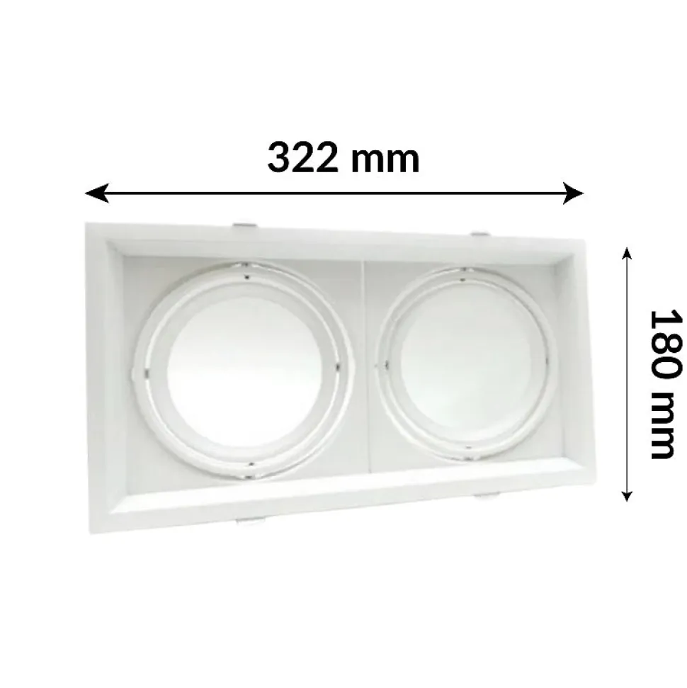 Le support Ampoules LED AR111 Encastrable Double Projecteurs dispose de deux anneaux pour un éclairage puissant bidirectionnel. Nous vous recommandons de percer un trou de dimensions 322 millimètres x 180 millimètres. Le support est très facile à encastrer au plafond ou au mur. Les anneaux sont faits pour accueillir des ampoules LED AR111. Avec son style épuré, moderne et classique, le support ampoules LED AR111 encastrable double projecteur s’adapte de manière optimale dans de multiples décors intérieurs. Comme les pièces (salle de séjour, bureau, cuisine) ou les lieux de passage tels que les couloirs. Son système amovible vous permettra de personnaliser vos inclinaisons d’éclairage. Découvrez compatible avec le support d’ampoule encastrable LED double projecteur. Ampoule LED AR111 non fournie.