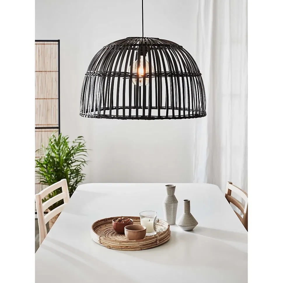 Une ambiance naturelle et chaleureuseAvec son grand abat-jour de 60 cm en métal noir ajouré au motif organique, la suspension COTTAGE de Markslöjd invite à la détente. Son style évoque une maison de campagne contemporaine où la lumière se diffuse avec douceur.Design rustique et contemporainLe mélange du fer noir et du bambou confère à ce plafonnier un caractère unique, idéal pour créer une ambiance naturelle dans une cuisine, une salle à manger ou même une chambre à coucher.Éclairage doux et effet décoratifL’abat-jour ajouré projette un joli jeu d’ombres sur les murs et le plafond. Associez-le à une ampoule LED décorative pour un effet encore plus saisissant.Installation simple et flexibleLa suspension est équipée d’un câble noir de 150 cm et d’un crochet de plafond permettant une installation rapide et facile.Parfait seul ou en enfiladeLe modèle COTTAGE peut se suspendre en solo au-dessus d’une table ou s’utiliser en série pour une déco plus marquée. Une pièce tendance au charme intemporel.