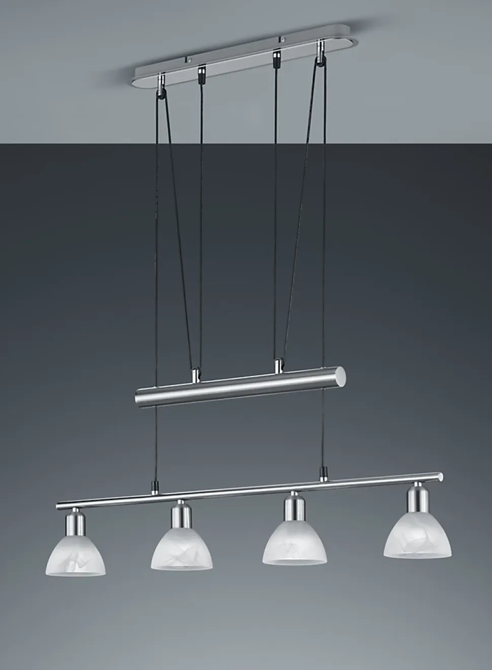 Les caractéristiques techniquesLa suspension Led Levisto de Trio est équipée de 4 ampoules LED E14 incluses, chacune offrant 470 lumens à 3000 Kelvin (blanc chaud) pour une lumière confortable et efficace. D’une puissance de 4,9W par ampoule, ce luminaire consomme peu d’énergie tout en garantissant une belle qualité d’éclairage. Grâce à la technologie LED, vous bénéficiez d’une longue durée de vie de 25 000 heures et d’un allumage instantané sans échauffement.Les avantages esthétiquesSon design élégant et discret associe un corps en nickel mat à des diffuseurs en verre couleur albâtre. Il s’intègre aussi bien dans les intérieurs modernes que classiques, ajoutant une touche de sophistication sans excès. L’effet albâtre diffuse une lumière douce et homogène, parfaite pour l’espace repas.Installation et dimensionsLa hauteur réglable entre 95 et 160 cm grâce au système de suspension yoyo rend ce luminaire très adaptable. Avec ses 80 cm de largeur et 11 cm de profondeur, il convient parfaitement au-dessus d’une table. Il est classé IP20 et ne convient qu’à un usage intérieur.