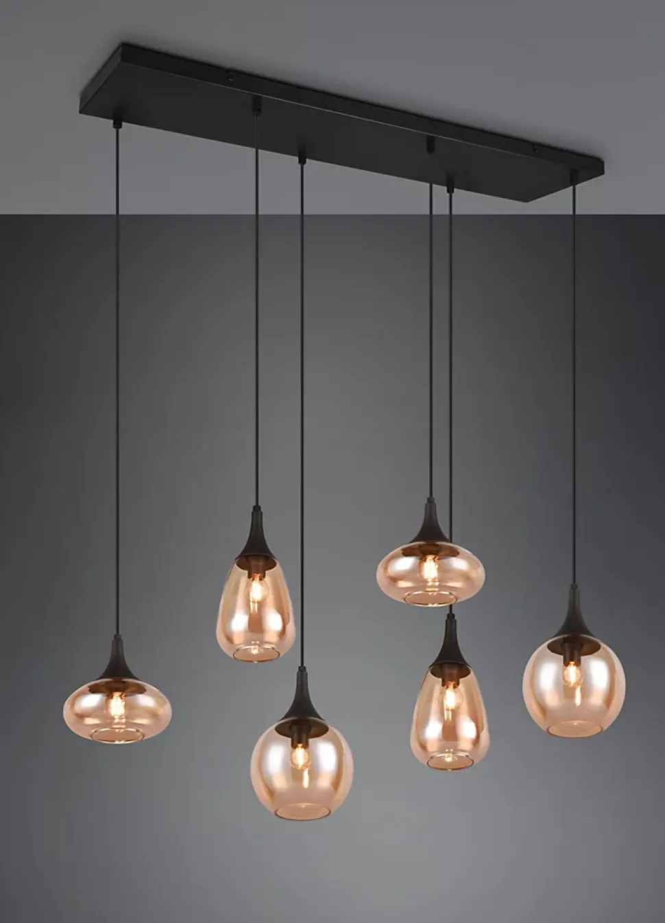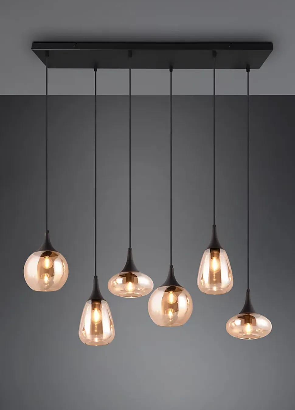 Les caractéristiques techniquesLa suspension Lumina de Trio avec son design élégant se distingue par ses abat-jour en verre ambré et son corps en métal noir mat. Le luminaire est conçu pour accueillir six ampoules E14 (non incluses) de 40W maximum.Avec une largeur de 93,8 cm et une hauteur ajustable jusqu’à 150 cm, la suspension Lumina s’adapte à divers types de plafonds et peut être installée selon vos préférences de hauteur. Idéale pour une salle à manger ou un salon, elle crée une atmosphère chaleureuse et accueillante.Les avantages esthétiquesLa suspension Lumina joue avec des formes géométriques variées pour ses abat-jour en verre, créant un jeu de lumière unique. Le contraste entre le métal noir mat et les teintes de verre ambrées apportent une touche moderne et sophistiquée à votre décoration intérieure.La possibilité d’utiliser des ampoules LED permet non seulement de réaliser des économies d’énergie allant jusqu’à 80%, mais aussi de bénéficier d’une lumière de haute qualité et d’une faible émission de chaleur.Ce luminaire s’intègre facilement dans des concepts d’habitation variés et s’adapte à une large gamme de décors grâce à ses couleurs neutres et à son design intemporel.