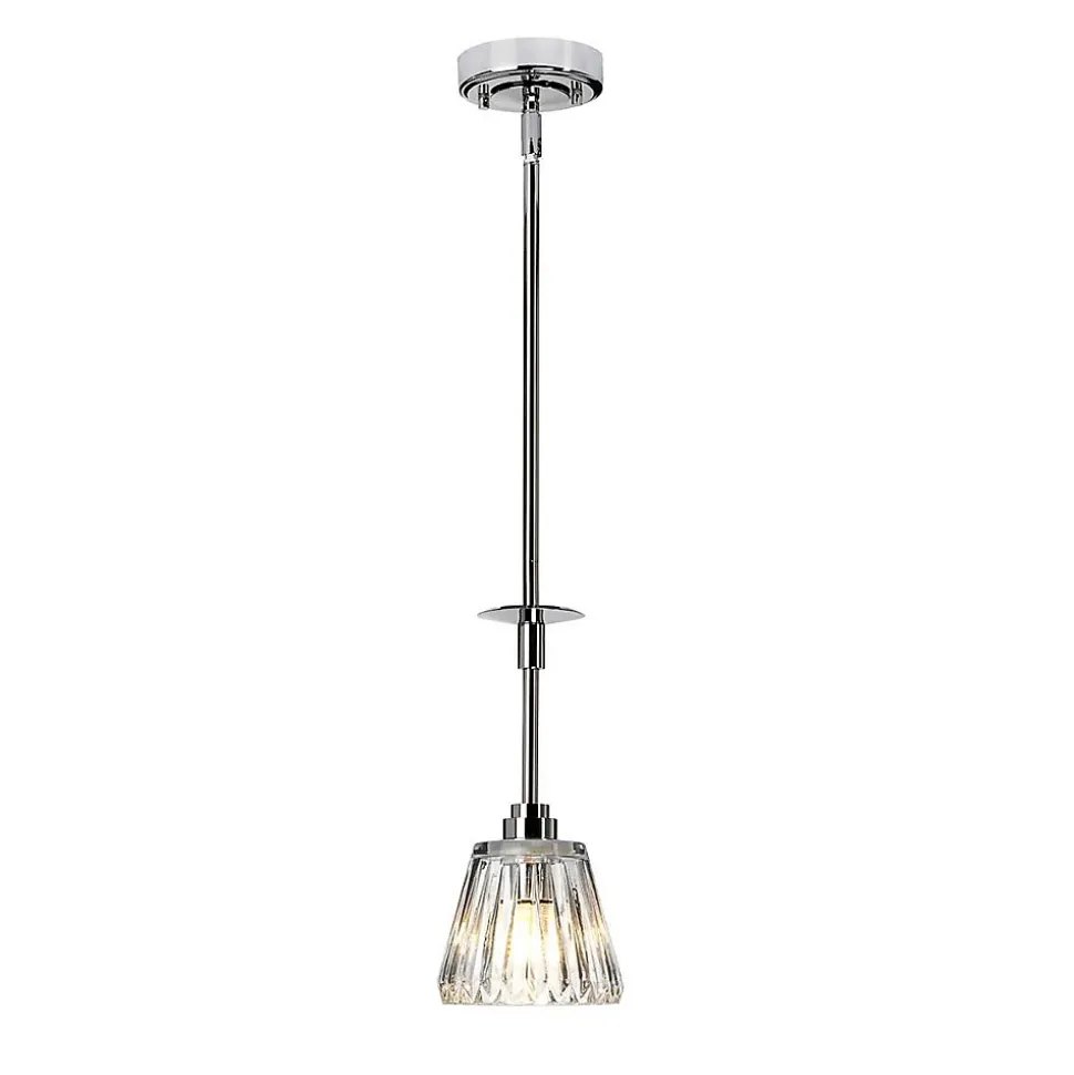 La gamme Agatha présente un indice de protection IP44 pour les salles de bains, mais peut également être utilisée dans les couloirs et autres espaces de vie. Une LED intégrée éclaire la tige en acrylique de l’applique murale et de la suspension à 3 lampes. La lumière scintille à travers les abat-jours en verre taillé transparent de tous les modèles. La collection est disponible en deux finitions : chrome poli et nickel brossé.