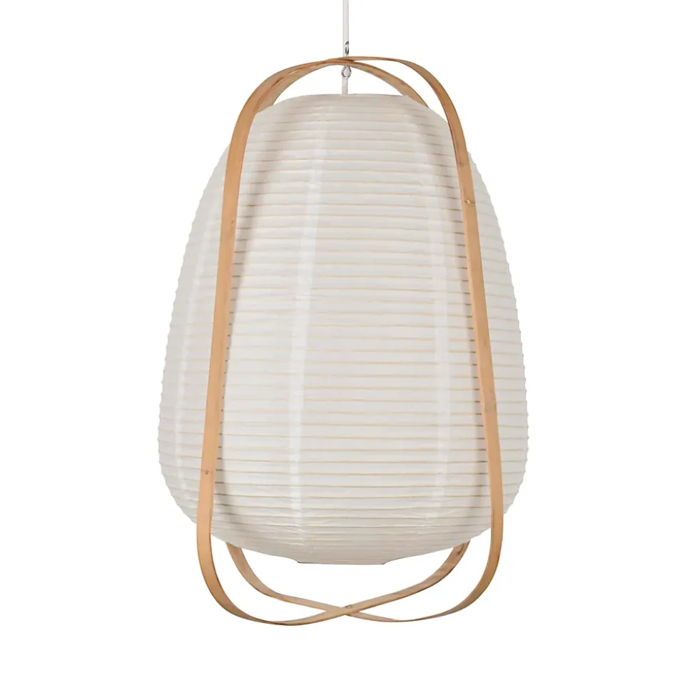 Suspension forme lanterne en papier japonais et structure en bambou. Coloris : blanc. IP20. D36cm – H47cm. Classe 2. E27-40W.