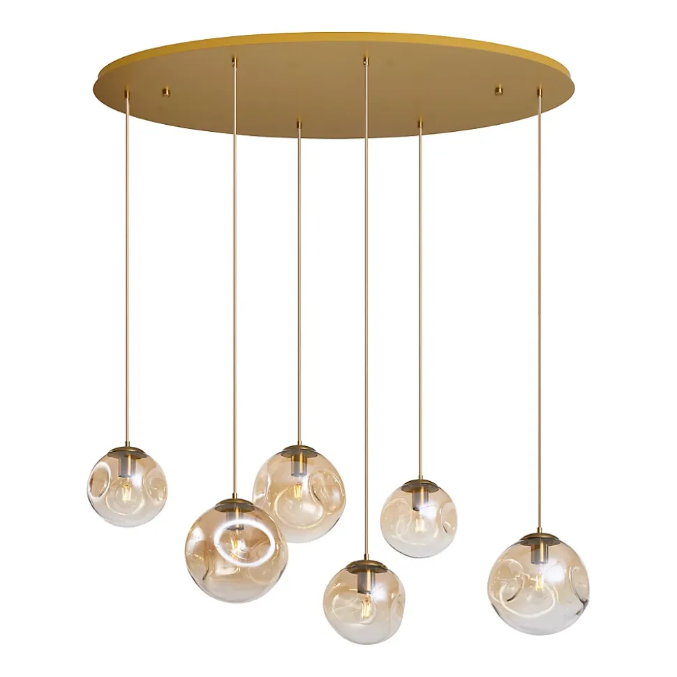 Ajoutez une touche de luxe à votre intérieur !Voici la suspension Art Déco Douglass en laiton avec verre ambré. Cette magnifique lampe à six sources lumineuses est un véritable accroche-regard qui confère instantanément à toute pièce un aspect élégant et stylé. Son design unique combine la sophistication de l’Art Déco avec des éléments modernes, faisant de cette suspension un complément parfait aux intérieurs classiques et contemporains.La suspension Douglass diffuse une lumière chaude et atmosphérique, idéale pour éclairer les salons et les salles à manger. La combinaison du laiton et du verre ambré crée une atmosphère riche et accueillante, tandis que les six sources lumineuses fournissent une luminosité suffisante pour toutes les occasions.