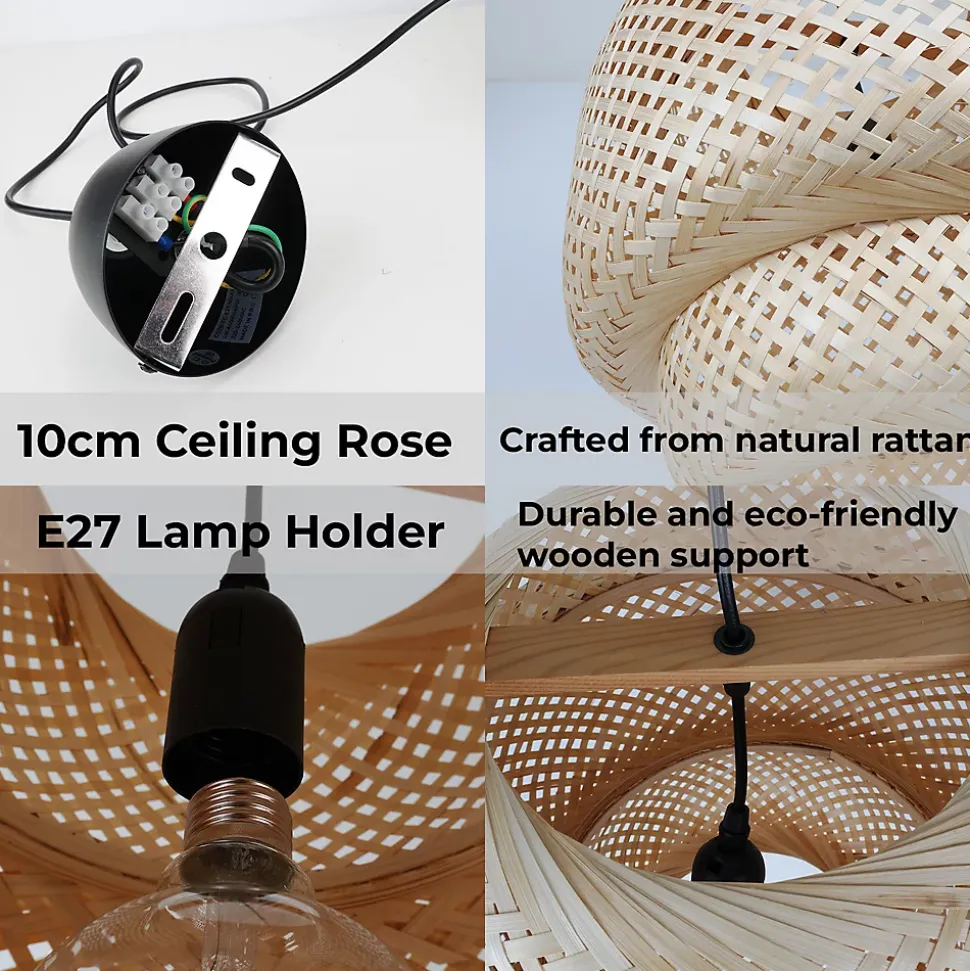 Suspension en osier « Mini TARTA » D.28 cm – Artisanale, E27, support en bois, hauteur réglableDesign artisanal avec matériaux naturelsLa suspension Mini TARTA est fabriquée à la main en fibres d’osier naturel avec un support en bois véritable, apportant un style chaleureux et durable qui s’intègre parfaitement dans des intérieurs d’inspiration naturelle, bohème ou moderne.Douille E27 sur bois naturelLa douille E27 est intégrée sur une pièce en bois naturel et est compatible avec des ampoules E27 jusqu’à 40 W (ampoule non incluse). Elle permet de choisir librement l’intensité et le type de lumière selon l’ambiance souhaitée.Effet lumineux décoratifLe tressage en osier filtre la lumière en créant un jeu d’ombres décoratif, tandis que les ouvertures supérieure et inférieure offrent un éclairage fonctionnel et chaleureux, idéal comme lumière principale ou décorative.Montage facile et hauteur réglableL’abat-jour s’assemble facilement grâce à un système simple. Il est livré avec un câble réglable jusqu’à 90 cm et un pavillon de plafond de 10 cm de diamètre, permettant d’adapter la hauteur à chaque espace.Dimensions compactes et grande polyvalenceAvec un diamètre de 28 cm, la Mini TARTA est idéale pour les cuisines, îlots, chambres, couloirs ou pour créer des compositions multiples dans les salles à manger et les espaces commerciaux, apportant une touche naturelle et élégante.Fiche techniqueMarque : ALPINALUZModèle : Mini TARTAMatériaux :Abat-jour : Osier naturelSupport : Bois naturelPavillon : Acier laquéDimensions : D.28 cmLongueur du câble : 90 cm (réglable)Diamètre du pavillon : 10 cmDouille : E27 (max. 40 W, ampoule non incluse)Style : Rustique / Bohème / ModerneUtilisation : Intérieur (IP20)Installation : Montage simple requis