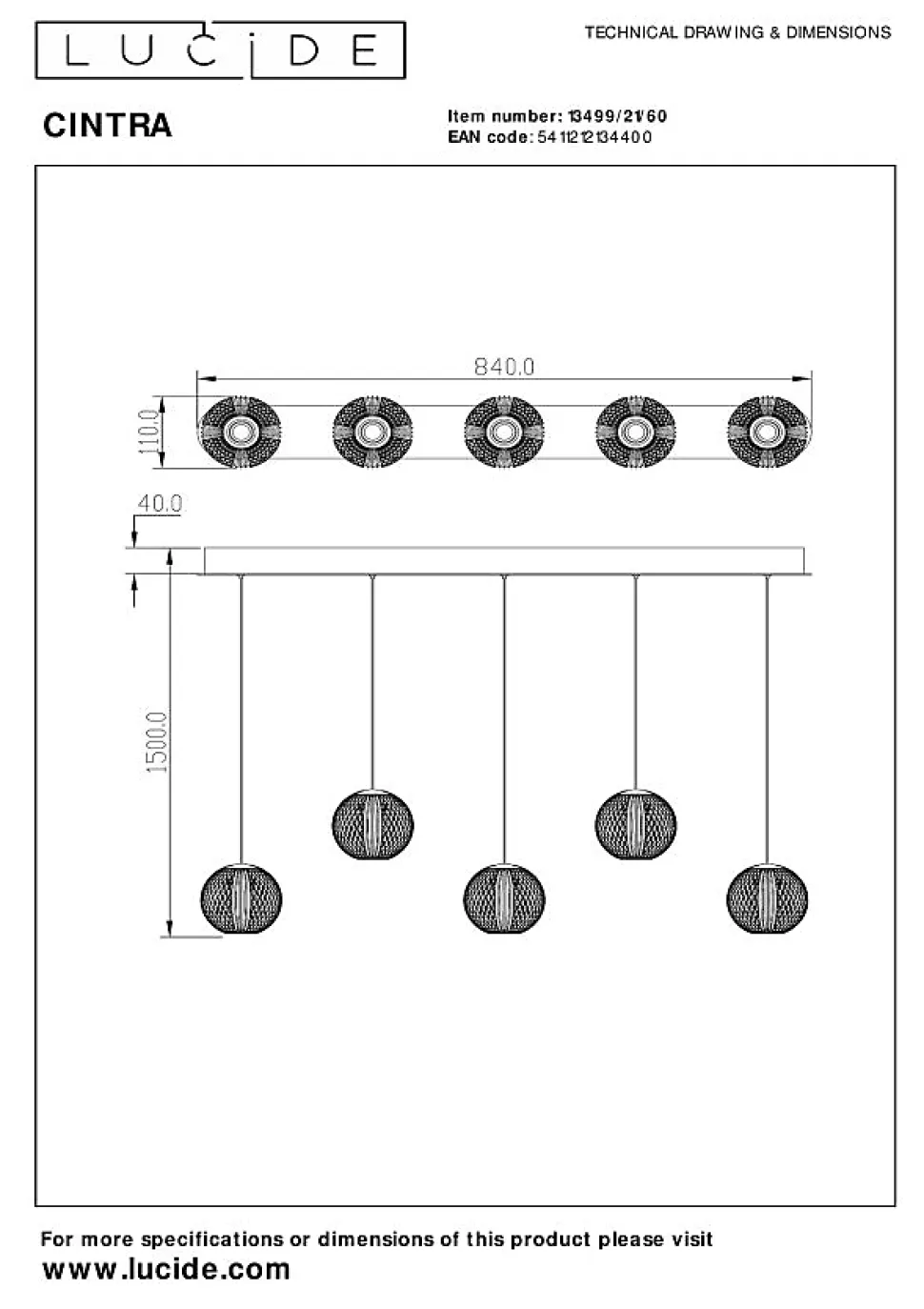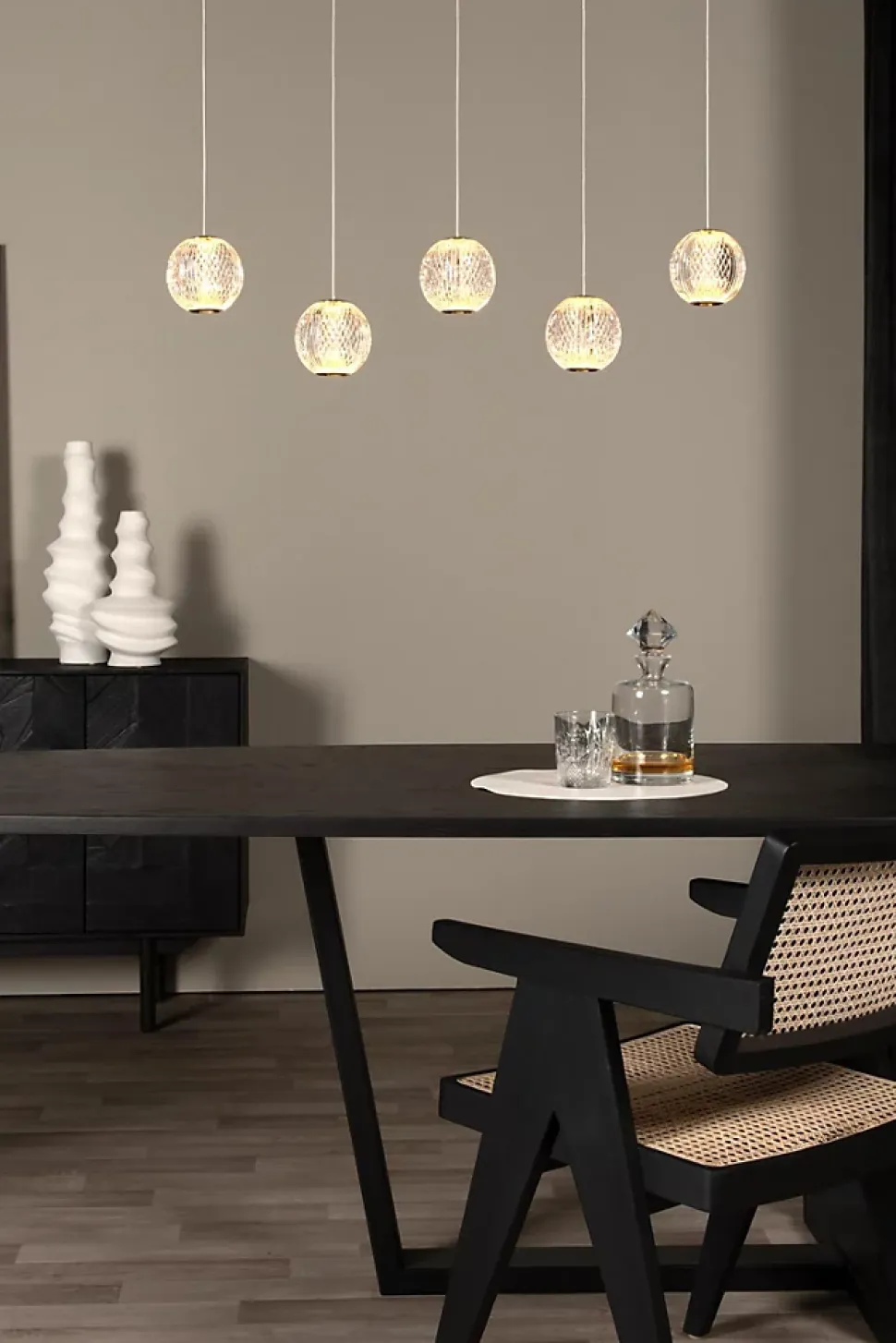 Laissez-vous séduire par les suspensions de Cintra en 1 ligne épurée. Avec leurs rainures typiques, les abat-jours sphériques en acrylique transparent rappellent le cristal. Un véritable accroche-regard au-dessus de la table à manger ou dans votre salon. Cette lampe suspendue est réglable en hauteur et avec ses dimensions de 11 x 11 x 9,8 centimètres, les abat-jours transparents s’intègrent parfaitement dans votre espace. Les détails en laiton complètent le tableau. L’ampoule LED intégrée à intensité variable constitue un atout supplémentaire de cette source de lumière étincelante.Caractéristiques uniques:• Équipé d’une lampe LED intégrée à intensité variable• Dispose d’une lumière blanche chaude (2700K)• Cette lampe est ajustable en hauteur• Facile à connecter à un variateur (non fourni)• Fabriqué en acryliquePrincipales caractéristiques du produit:• Consommation énergétique: 5×4,7W / 230V / A intensité variable (Ampoules incluses)• Dimensions: Lon.84 x Larg.11 x Haut.150 cm• 3 Ans garantie sur le luminairePourquoi choisir l’éclairage Lucide?Lucide incarne un design innovant, un savoir-faire artisanal et une fiabilité exemplaire. En tant qu’entreprise familiale belge avec plus de trois décennies d’expertise, nous concevons des éclairages de haute qualité qui enrichissent et transforment chaque espace, tant intérieur qu’extérieur. Notre collection polyvalente comprend des luminaires durables et des sources lumineuses économes en énergie, soigneusement conçus par nos propres experts et fabriqués selon les normes CE les plus strictes. Grâce à notre large gamme, nous vous proposons toujours une solution d’éclairage adaptée, quel que soit le style ou l’espace. Ainsi, nous illuminons non seulement votre espace de vie mais aussi votre processus de choix dans la recherche d’un éclairage de qualité et abordable. Chez Lucide, nous combinons innovation et savoir-faire pour un éclairage qui …