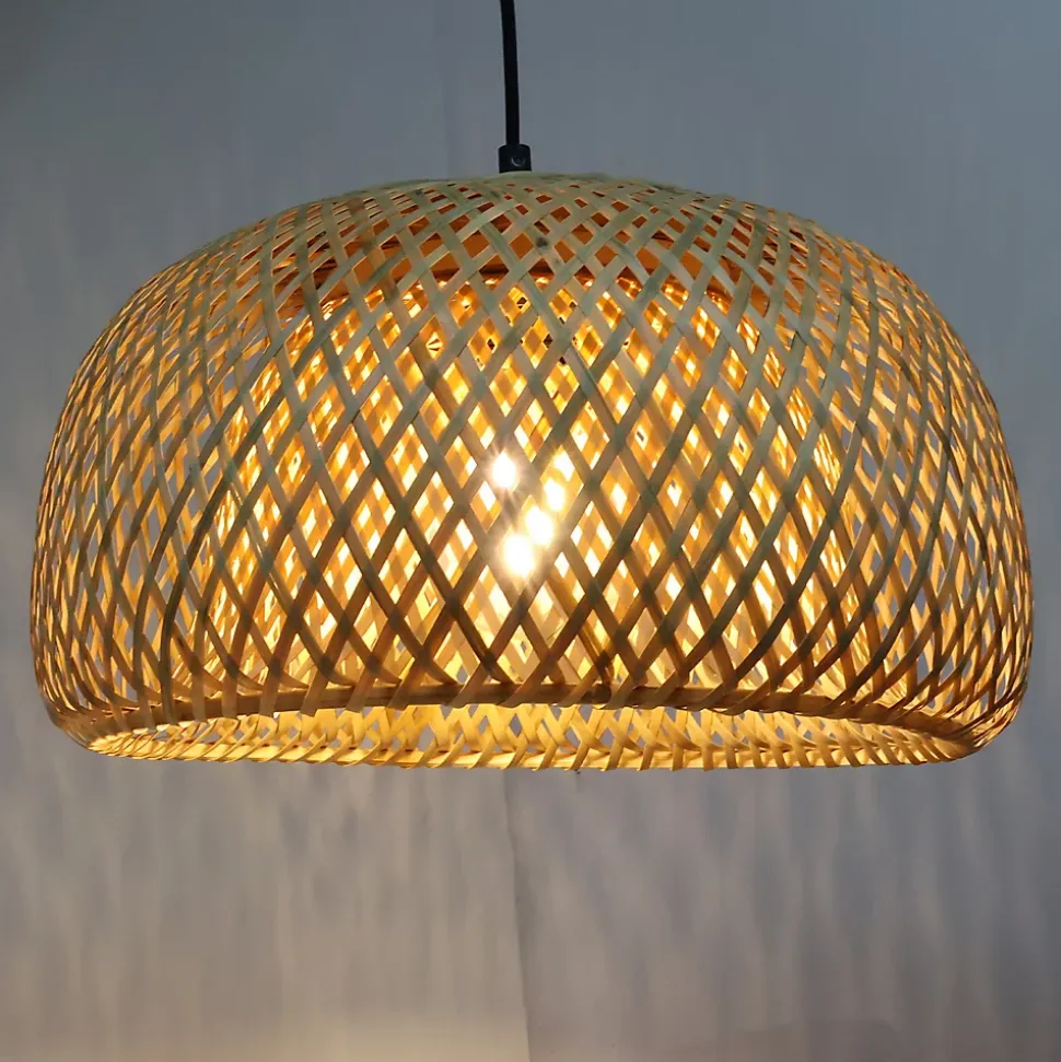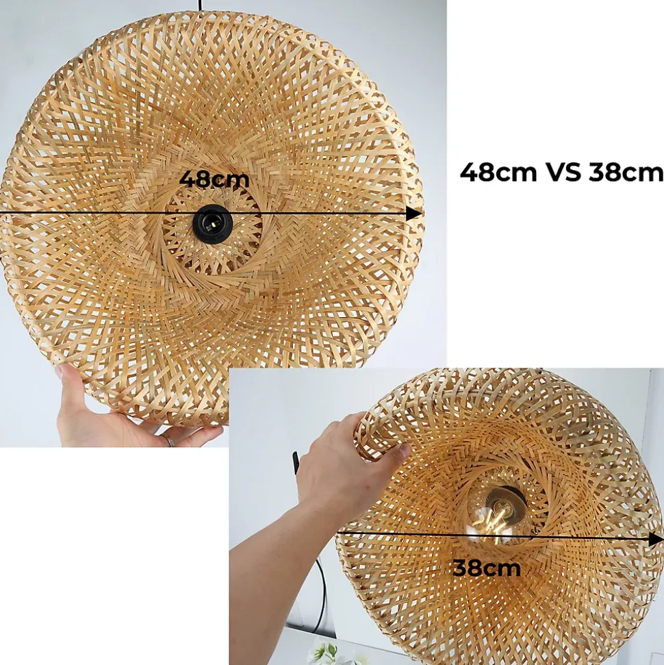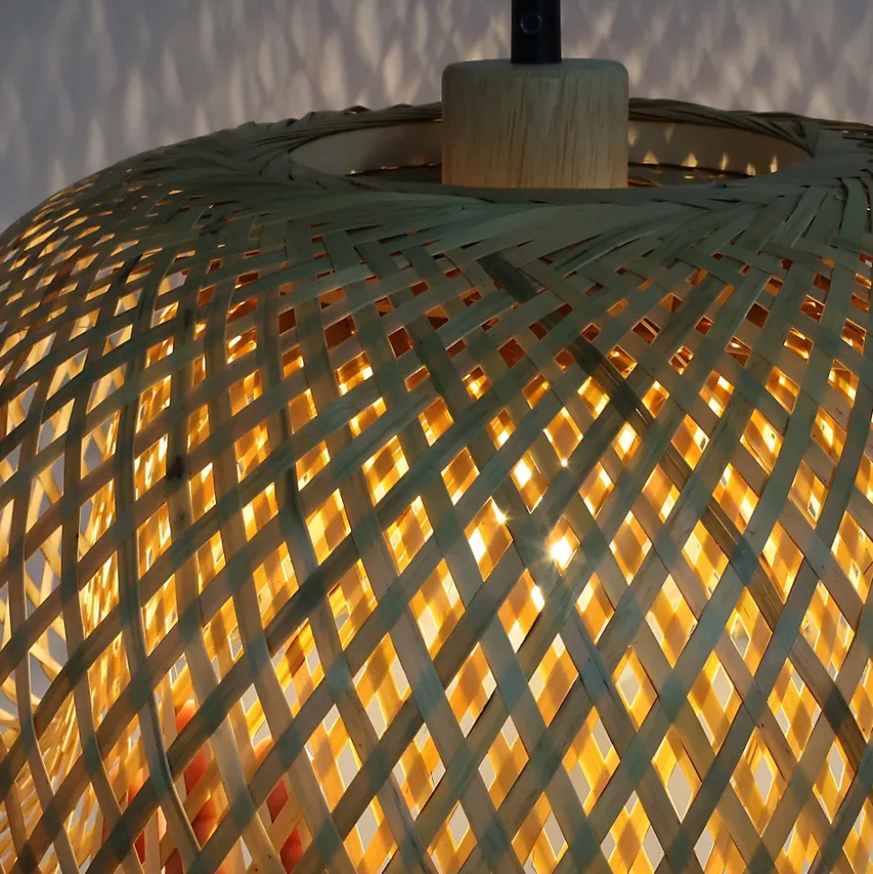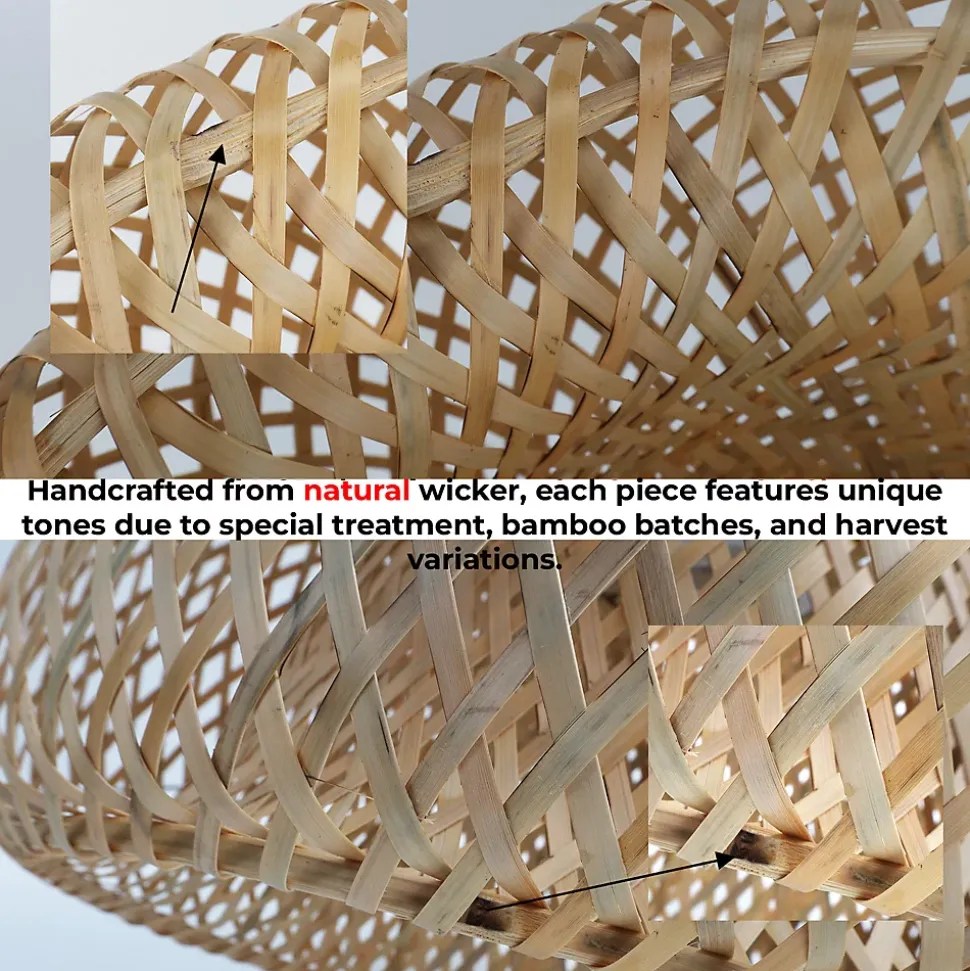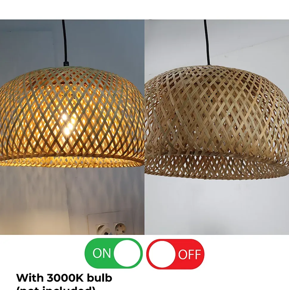 Suspension en osier de bambou « OSAKA » Ø380 x 200 mmLa suspension « OSAKA » est fabriquée à la main à partir de fibres d’osier de bambou, garantissant résistance et durabilité. Son design raffiné et élégant en fait un complément décoratif idéal pour créer une ambiance chaleureuse et accueillante.Caractéristiques principales :Matériau : Tressée à la main avec des fibres d’osier de bambou, finition de haute qualité.Diffusion de la lumière : Le tissage permet une diffusion douce et agréable de la lumière, créant une atmosphère détendue et harmonieuse.Options de personnalisation : Disponible avec trois types de pavillon et câble (blanc, noir et corde naturelle) pour s’adapter à tout style décoratif.Compatibilité : Douille E27, max 40W (ampoule non incluse).Dimensions : Ø380 x 200 mm.Hauteur réglable : Câble ajustable jusqu’à 90 cm.Usage intérieur : Classe IP20.Description :La lampe suspendue « OSAKA » associe un style naturel et sophistiqué, parfaite pour les salons, chambres, restaurants ou commerces. Son tressage soigné crée de magnifiques jeux d’ombre et de lumière, apportant une touche décorative unique à chaque espace.